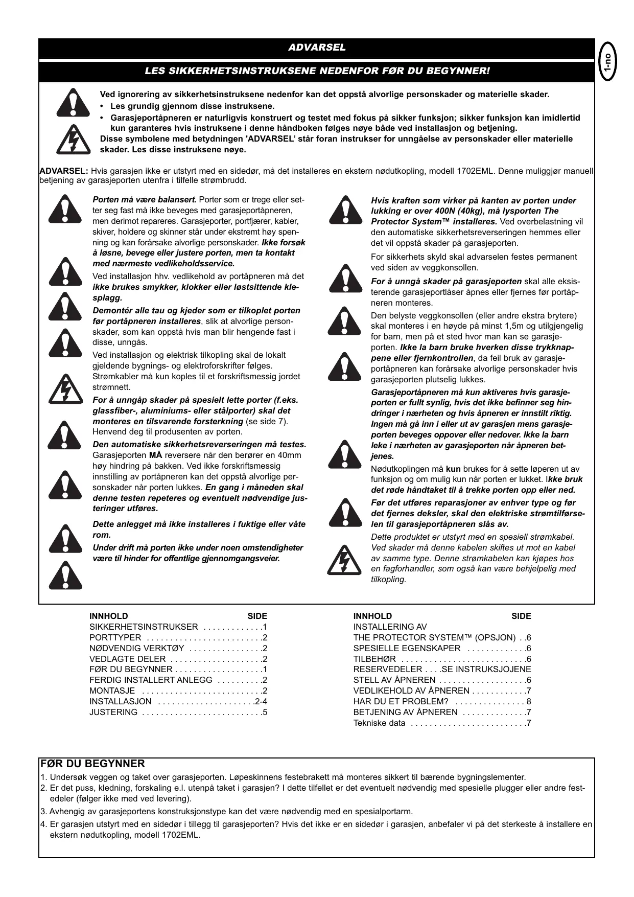LES SIKKERHETSINSTRUKSENE NEDENFOR FØR DU BEGYNNER! Ved ignorering av sikkerhetsinstruksene nedenfor kan det oppstå alvorlige personskader og materielle skader. • Les grundig gjennom disse instruksene. • Garasjeportåpneren er naturligvis konstruert og testet med fokus på sikker funksjon; sikker funksjon kan imidlertid kun garanteres hvis instruksene i denne håndboken følges nøye både ved installasjon og betjening. Disse symbolene med betydningen 'ADVARSEL’ står foran instrukser for unngåelse av personskader eller materielle skader. Les disse instruksene nøye. ADVARSEL: Hvis garasjen ikke er utstyrt med en sidedør, må det installeres en ekstern nødutkopling, modell 1702EML. Denne muliggjør manuell betjening av garasjeporten utenfra i tilfelle strømbrudd. Porten må være balansert. Porter som er trege eller setter seg fast må ikke beveges med garasjeportåpneren, men derimot repareres. Garasjeporter, portfjærer, kabler, skiver, holdere og skinner står under ekstremt høy spenning og kan forårsake alvorlige personskader. Ikke forsøk å løsne, bevege eller justere porten, men ta kontakt med nærmeste vedlikeholdsservice. Ved installasjon hhv. vedlikehold av portåpneren må det ikke brukes smykker, klokker eller løstsittende klesplagg. Demontér alle tau og kjeder som er tilkoplet porten før portåpneren installeres, slik at alvorlige personskader, som kan oppstå hvis man blir hengende fast i disse, unngås. Ved installasjon og elektrisk tilkopling skal de lokalt gjeldende bygnings- og elektroforskrifter følges. Strømkabler må kun koples til et forskriftsmessig jordet strømnett. For å unngåp skader på spesielt lette porter (f.eks. glassfiber-, aluminiums- eller stålporter) skal det monteres en tilsvarende forsterkning (se side 7). Henvend deg til produsenten av porten. Den automatiske sikkerhetsreverseringen må testes. Garasjeporten MÅ reversere når den berører en 40mm høy hindring på bakken. Ved ikke forskriftsmessig innstilling av portåpneren kan det oppstå alvorlige personskader når porten lukkes. En gang i måneden skal denne testen repeteres og eventuelt nødvendige justeringer utføres. Dette anlegget må ikke installeres i fuktige eller våte rom. Under drift må porten ikke under noen omstendigheter være til hinder for offentlige gjennomgangsveier.