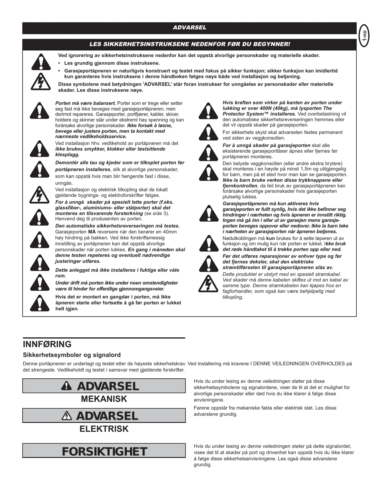7. Ne pas porter de montre, de bague ou d’habit flottant durant l’installation ou la maintenance. Ceux-ci pourraient être accrochés par la porte ou le mécanisme d’entraînement.