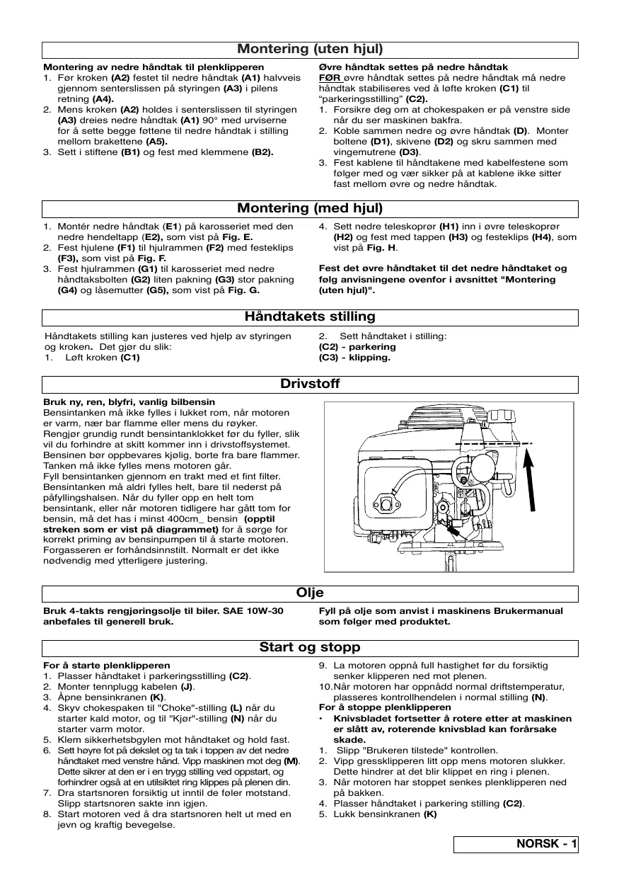 Rengioring + BRUK HANSKER + Hold plenklipperen din ren - avkuttet gress som samies i luftinntakene, rundt motoren eller under dekselet kan fore til fare for brann. + _ikke rengjor med kjemikalier, inkludert bensin og opplesningsmidier - noen av disse kan odelegge je deler av plastikk.