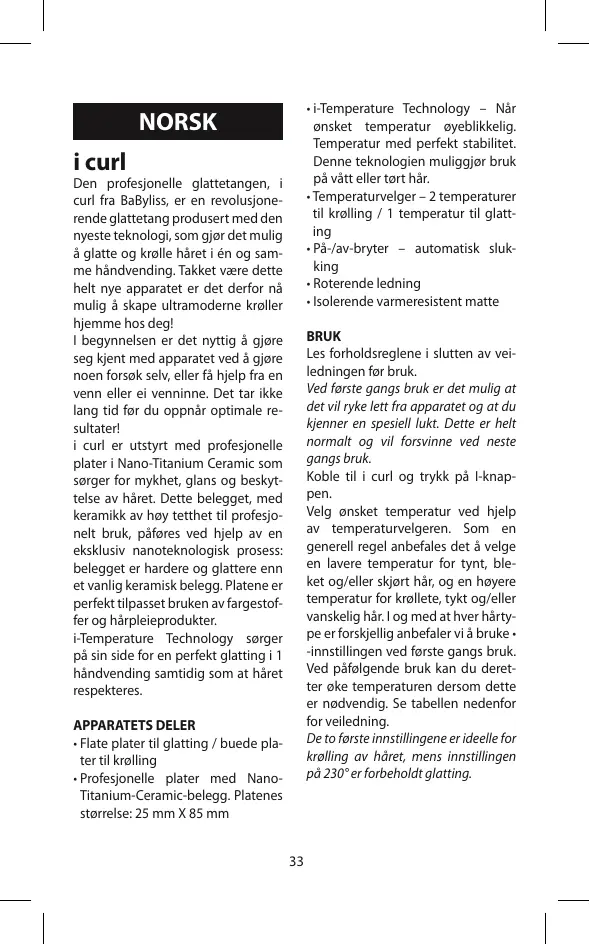 - Isolerende varmeresistent matte NORSK i curl Den profesjonelle glattetangen, i curl fra BaByliss, er en revolusjonerende glattetang produsert med den nyeste teknologi, som gjør det mulig å glatte og krølle håret i én og samme håndvending. Takket være dette helt nye apparatet er det derfor nå mulig å skape ultramoderne krøller hjemme hos deg! I begynnelsen er det nyttig å gjøre seg kjent med apparatet ved å gjøre noen forsøk selv, eller få hjelp fra en venn eller ei venninne. Det tar ikke lang tid før du oppnår optimale resultater! i curl er utstyrt med profesjonelle plater i Nano-Titanium Ceramic som sørger for mykhet, glans og beskyttelse av håret. Dette belegget, med keramikk av høy tetthet til profesjonelt bruk, påføres ved hjelp av en eksklusiv nanoteknologisk prosess: belegget er hardere og glattere enn et vanlig keramisk belegg. Platene er perfekt tilpasset bruken av fargestoffer og hårpleieprodukter. i-Temperature Technology sørger på sin side for en perfekt glatting i 1 håndvending samtidig som at håret respekteres. BRUK Les forholdsreglene i slutten av veiledningen før bruk. Ved første gangs bruk er det mulig at det vil ryke lett fra apparatet og at du kjenner en spesiell lukt. Dette er helt normalt og vil forsvinne ved neste gangs bruk. Koble til i curl og trykk på I-knappen. Velg ønsket temperatur ved hjelp av temperaturvelgeren. Som en generell regel anbefales det å velge en lavere temperatur for tynt, bleket og/eller skjørt hår, og en høyere temperatur for krøllete, tykt og/eller vanskelig hår. I og med at hver hårtype er forskjellig anbefaler vi å bruke • -innstillingen ved første gangs bruk. Ved påfølgende bruk kan du deretter øke temperaturen dersom dette er nødvendig. Se tabellen nedenfor for veiledning. De to første innstillingene er ideelle for krølling av håret, mens innstillingen på 230° er forbeholdt glatting. APPARATETS DELER