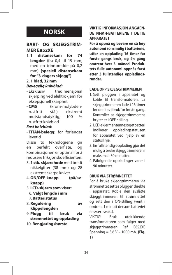 LADE OPP SKJEGGTRIMMEREN 1. Sett pluggen i apparatet og koble til transformatoren. La skjeggtrimmeren lade i 16 timer før den tas i bruk for første gang. Kontroller at skjeggtrimmerens bryter er i OFF-stilling. 2. LCD-skjermentennesogetbatteri indikerer oppladingsstatusen for apparatet ved hjelp av en statuslinje. 3. En fullstendig opplading gjør det mulig å bruke skjeggtrimmeren i maksimalt 30 minutter. 4. Påfølgende oppladinger varer i 90 minutter. BRUK VIA STRØMNETTET For å bruke skjeggtrimmeren via strømnettet settes pluggen direkte i apparatet. Koble den avslåtte skjeggtrimmeren til strømnettet og sett den i ON-stilling (vent i omtrent 1 minutt dersom batteriet er svært svakt). VIKTIG! Bruk utelukkende transformatoren som følger med skjeggtrimmeren Ref. E852XE Spenning = 3,6 V – 1000 mA. (Fig. 1) 34