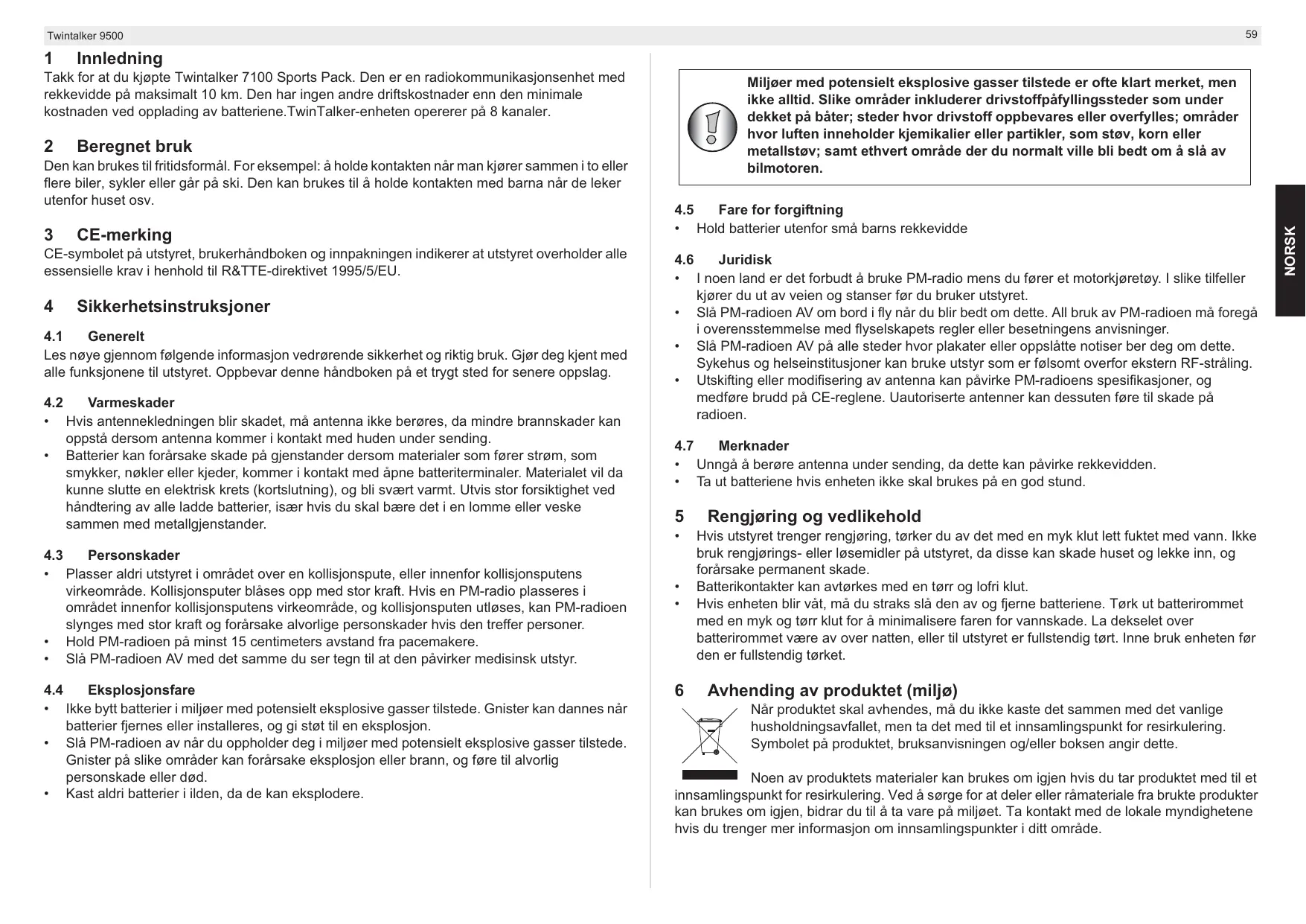 - Slå PM-radioen av nár du oppholder deg i miljøer med potensielt eksplosive gasser tilstede. Gnister på slike områder kan forårsake eksplosjon eller brann, og före til alvorlig personskade eller død.