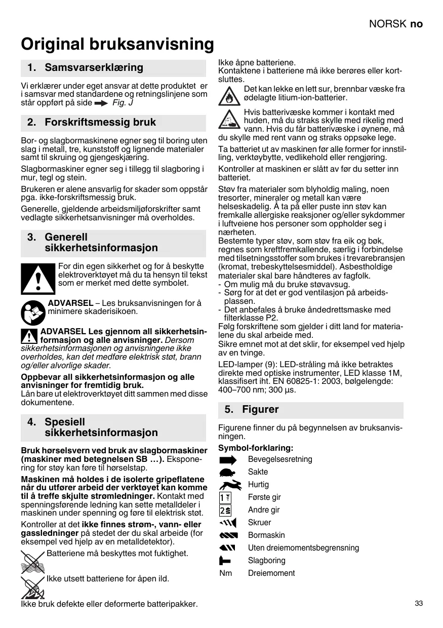 Fig. I. Sous réserve de modifications dans le sens du progrès technique. U = Tension du bloc batterie n0 = Vitesse à vide Couple lors du vissage : = vissage dans un matériau tendre (bois) M1 M3 = vissage dans un matériau dur (métal) M4 = Filet de la broche D max = Capacité du mandrin de perçage Valeurs totales de vibration (somme vectorielle triaxiale) déterminées conformément à la EN 60745 : ah, ID = Valeur d’émission de vibrations (perçage avec percussions dans le béton) ah, D = Valeur d’émission de vibrations (perçage dans le métal) ah, S = Valeur d’émission de vibrations (vissage sans percussion) Kh,... = Incertitude (vibration) Le niveau de vibration indiqué dans les présentes instructions est mesuré selon un procédé conforme à la norme EN 60745 et peut servir à comparer les différents outils électriques. Il est également approprié pour réaliser une estimation provisoire de l'amplitude de vibration. Le niveau de vibration indiqué correspond aux applications principales de l'outil électrique. Par ailleurs, le niveau de vibration peut dévier si l'outil électrique est utilisé dans d'autres applications, avec des outils de travail différents ou avec une maintenance insuffisante. Cela peut entraîner une augmentation sensible de l'amplitude de vibration sur la durée totale de travail. Pour estimer de manière exacte l'amplitude de vibration, il faut également tenir compte des temps d'arrêt ou de marche à vide de l'outil. Cela peut entraîner une réduction sensible de l'amplitude de vibration sur la durée totale de travail. Définir les mesures de sécurité supplémentaires relatives à la protection de l'utilisateur contre les effets de vibration, telles que : maintenance de l'outil électrique et des outils de travail, maintien des mains au chaud, organisation du travail. Niveaux sonores types A : LpA = niveau de pression acoustique LWA Les caractéristiques indiquées sont soumises à tolérance (selon les normes en vigueur correspondantes).
