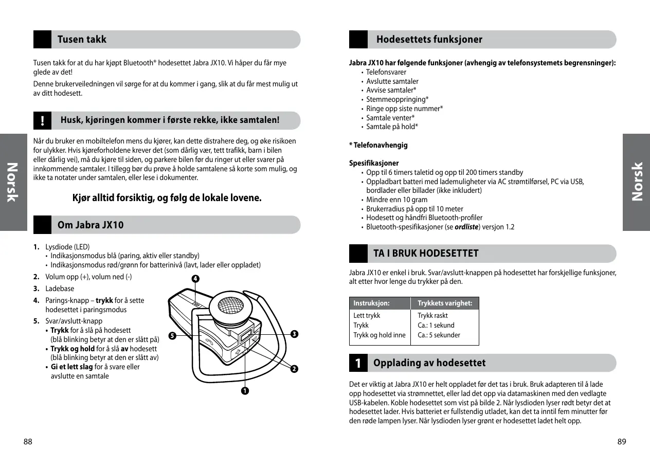 Jabra JX10 er enkel i bruk. Svar/avslutt-knappen pâ hodesettet har forskjellige funksjoner, a etter hvor lenge du trykker pà den.