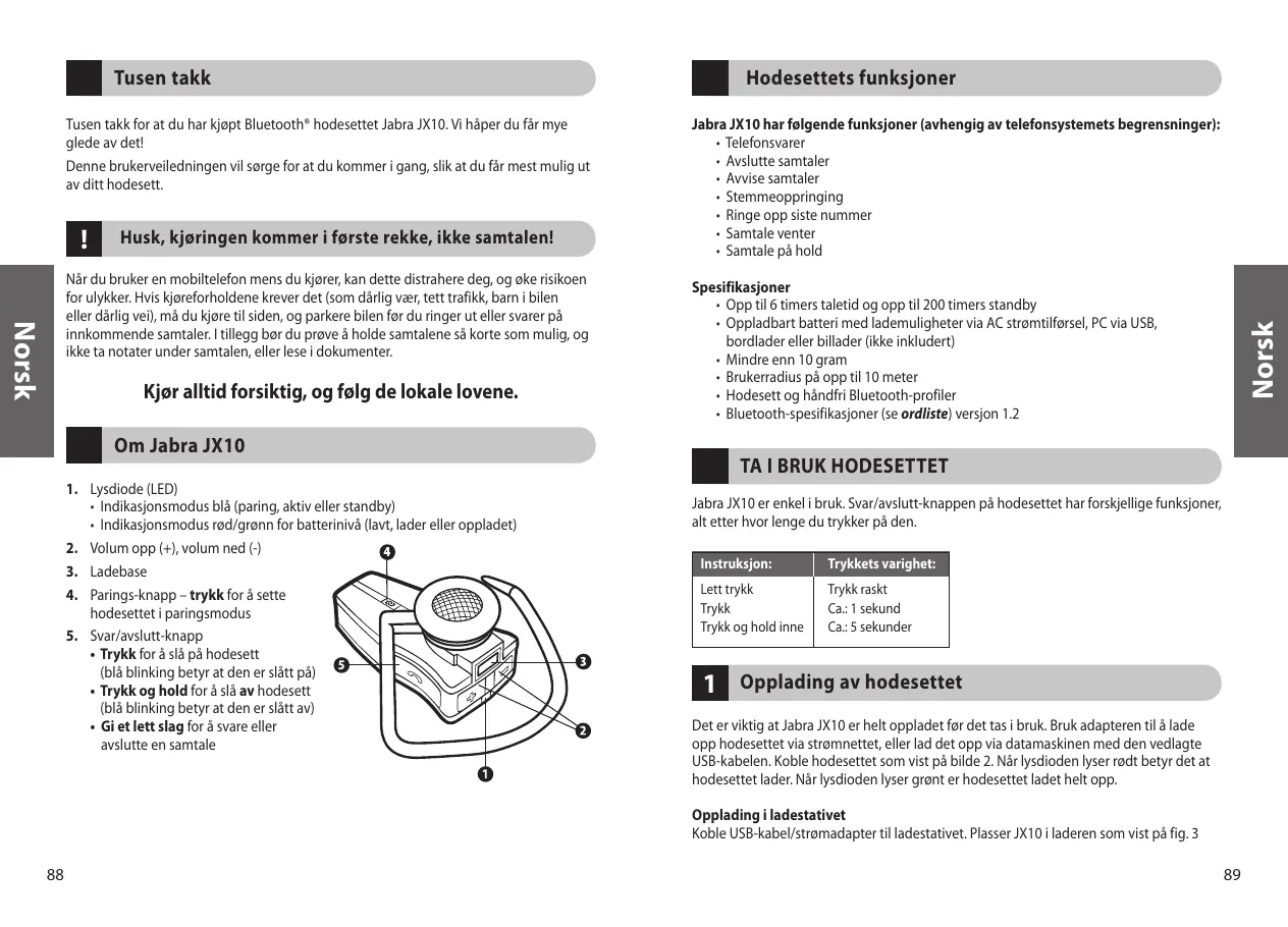 Jabra JX10 er enkel i bruk. Svar/avslutt-knappen pâ hodesettet har forskjellige funksjoner, a etter hvor lenge du trykker pà den.