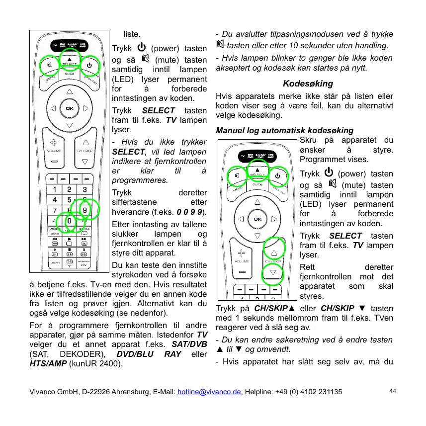 être transférée (copiée), p. ex. POWER, jus- 4. qu’à ce que l’UR 2400 confirme le transfert en passant du clignotement à l’allumage Pour effacer toutes les fonctions de permanent de la DEL. Ce changement de si- touche copiées (apprises) d’un appareil gnal signifie que le transfert (la copie) d’une fonction affectée à une touche donnée, p. 1. Pressez la touche SELECT autant de fois que nécessaire pour obtenir l’allumage de ex. Marche/Arrêt, vient d’être effectué avec la DEL de l’appareil désiré, p. ex. TV. succès. 2. Maintenez enfoncée simultanément les 7. Pour transférer d’autres fonctions de touche, touches LEARN et 3 jusqu’à ce que le répétez les étapes 5 et 6. voyant (DEL) s’éteint. Relâchez alors les 8. Pour mettre fin à la procédure de transfert, touches. La DEL clignote ensuite 2 fois pressez brièvement la touche LEARN. pour confirmer l’effacement. - AU bout d’environ 10 secondes d’inactivité, l’UR 2400 met également automatiquement fin à la procédure. Vivanco GmbH, D-22926 Ahrensburg, E-Mail: hotline@vivanco.de, Helpline: +49 (0) 4102 231135