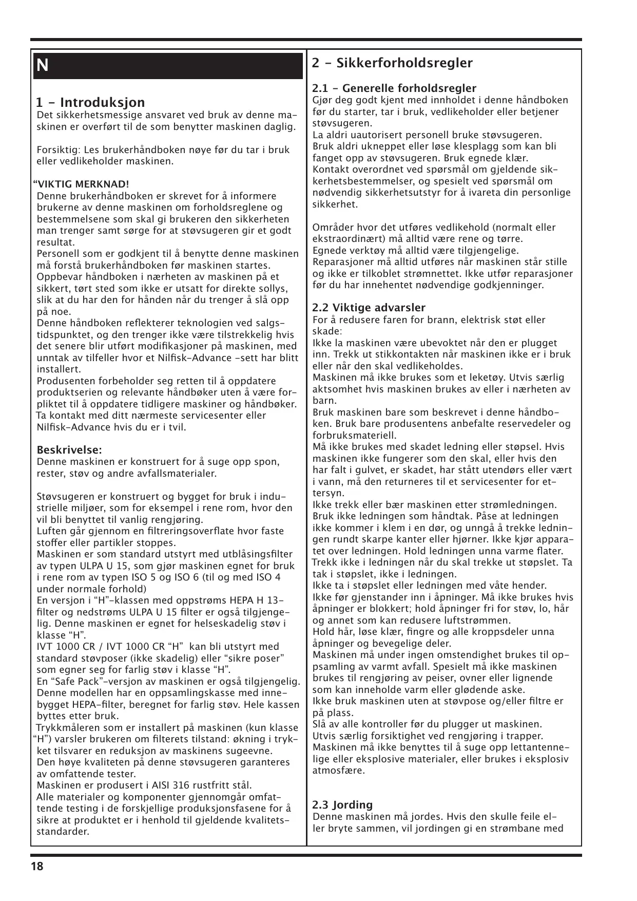 Het filterpatroon en de pakkingen verwijderen en vervangen Schroef de vier schroeven los. Til de roestvrij stalen behuizing met het filterpatroon op. Vervang het filterpatroon en de pakkingen. Plaats de behuizing terug door op de bovenkant ervan te drukken en de vier schroeven terug vast te schroeven. Monteer de handgreep terug en zet vast met de 2 schroeven. De gedemonteerde en vervangen uitblaasfilter moet worden opgeborgen in een plastic tas en moet op de gepaste manier worden weggeruimd. Wees bijzonder voorzichtig bij het vervangen van de hoofdfilter en uitblaasfilter, en draag in ieder geval een masker type P3. Opmerking De uitblaasfilter wordt beschouwd als giftig afval en moet ook als dusdanig worden behandeld. Le présent manuel a été rédigé afin dʼinformer les utilisateurs de la machine sur les précautions et les réglementations relatives à leur sécurité, et de maintenir lʼaspirateur en bon état de fonctionnement. Le personnel autorisé à travailler avec la machine doit comprendre le manuel avant de la mettre en marche. Garder le manuel à proximité de la machine, à un emplacement sec et protégé, non exposé à la lumière directe du soleil et immédiatement disponible pour être consulté au besoin. Le présent manuel reflète lʼétat le plus récent de la technologie au moment de la vente et ne peut pas être considéré comme approprié en cas de modifications ultérieures, sauf si un kit Nilfisk- Advance a été installé sur la machine. Le fabricant se réserve le droit de mettre à jour sa gamme de production et les manuels qui sʼy rapportent sans être tenu de mettre à jour les machines et manuels précédemment fournis. Consulter le centre de service après-vente le plus proche ou Nilfisk-Advance en cas de doute. Description : Cette machine a été conçue pour ramasser les copeaux, les débris, la poussière et autres déchets. Lʼaspirateur a été conçu et construit pour fonctionner en environnement industriel tel quʼune salle blanche où il peut servir au nettoyage normal. De lʼair passe à travers une surface filtrante où les solides en suspension sont retenus. En version standard, la machine est équipée de filtres de refoulement ULPA U 15 qui rendent la machine apte à une utilisation en salles blanches ISO 5 ET ISO 6 (en conditions normales, même ISO classe 4). Une version de classe « H » équipée dʼun filtre amont HEPA H 13 et dʼun filtre aval ULPA U 15 est également disponible. En classe « H », cette machine convient aussi contre les poussières présentant un risque pour la santé. Les modèles IVT 1000 CR / IVT 1000 CR «H» peuvent être équipé dʼun sac à poussière standard (poussière non dangereuse) ou dʼun « sac de sécurité » convenant à la poussière dangereuse en classe « H ». Une version « Safe Pack » de la machine est également disponible - celle-ci comporte un bac de ramassage de la poussière avec filtre HEPA intégré, utilisable pour la poussière dangereuse. Le bac complet est remplacé après usage. La jauge de pression installée sur la machine (classe « H » uniquement) prévient lʼopérateur de lʼétat du filtre : une augmentation de pression représente une réduction de la puissance dʼaspiration de la machine La qualité élevée de lʼaspirateur est garantie par les tests les plus sévères.