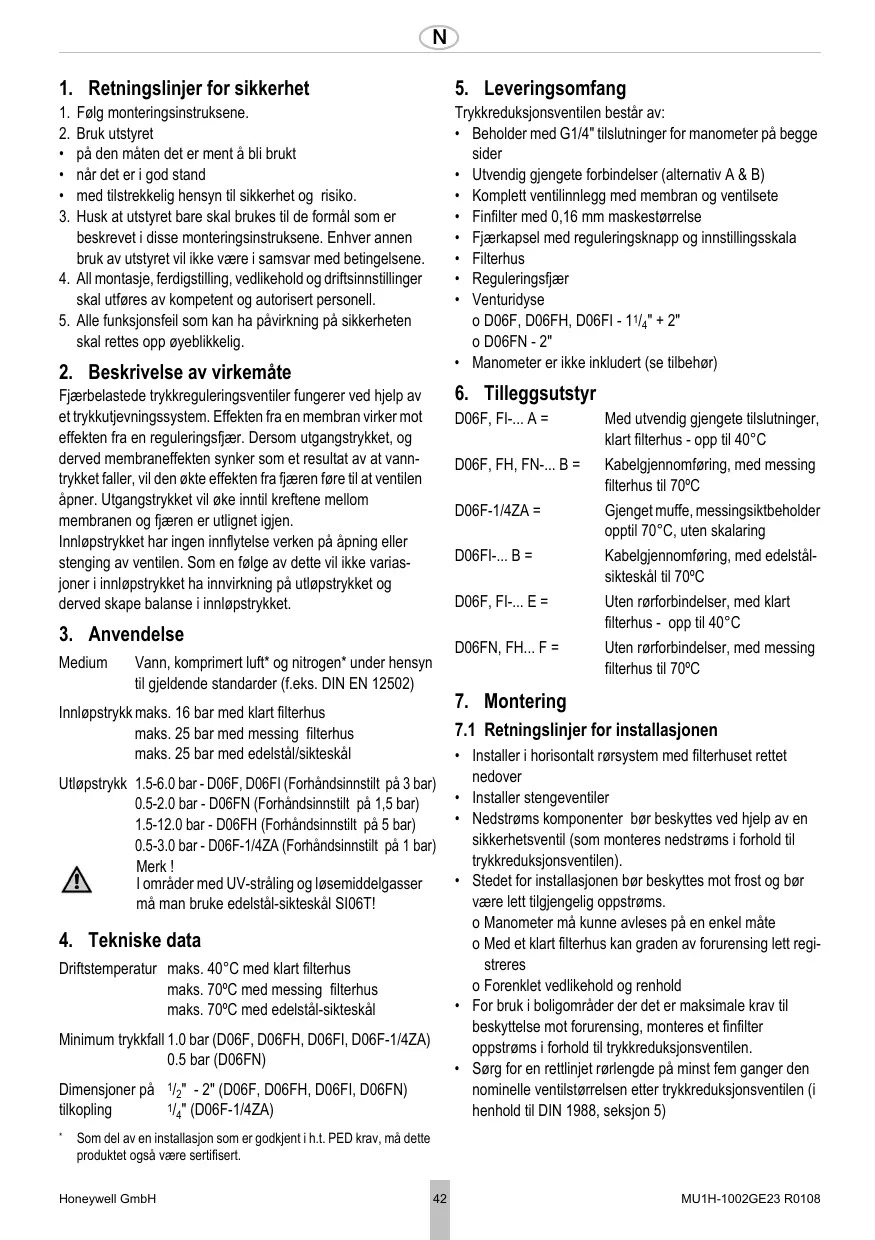 Utløpstrykk 1.5-6.0 bar - D06F, D06FI (Forhåndsinnstilt på 3 bar) 0.5-2.0 bar - D06FN (Forhåndsinnstilt på 1,5 bar) 1.5-12.0 bar - D06FH (Forhåndsinnstilt på 5 bar) 0.5-3.0 bar - D06F-1/4ZA (Forhåndsinnstilt på 1 bar) Merk ! I områder med UV-stråling og løsemiddelgasser må man bruke edelstål-sikteskål SI06T!