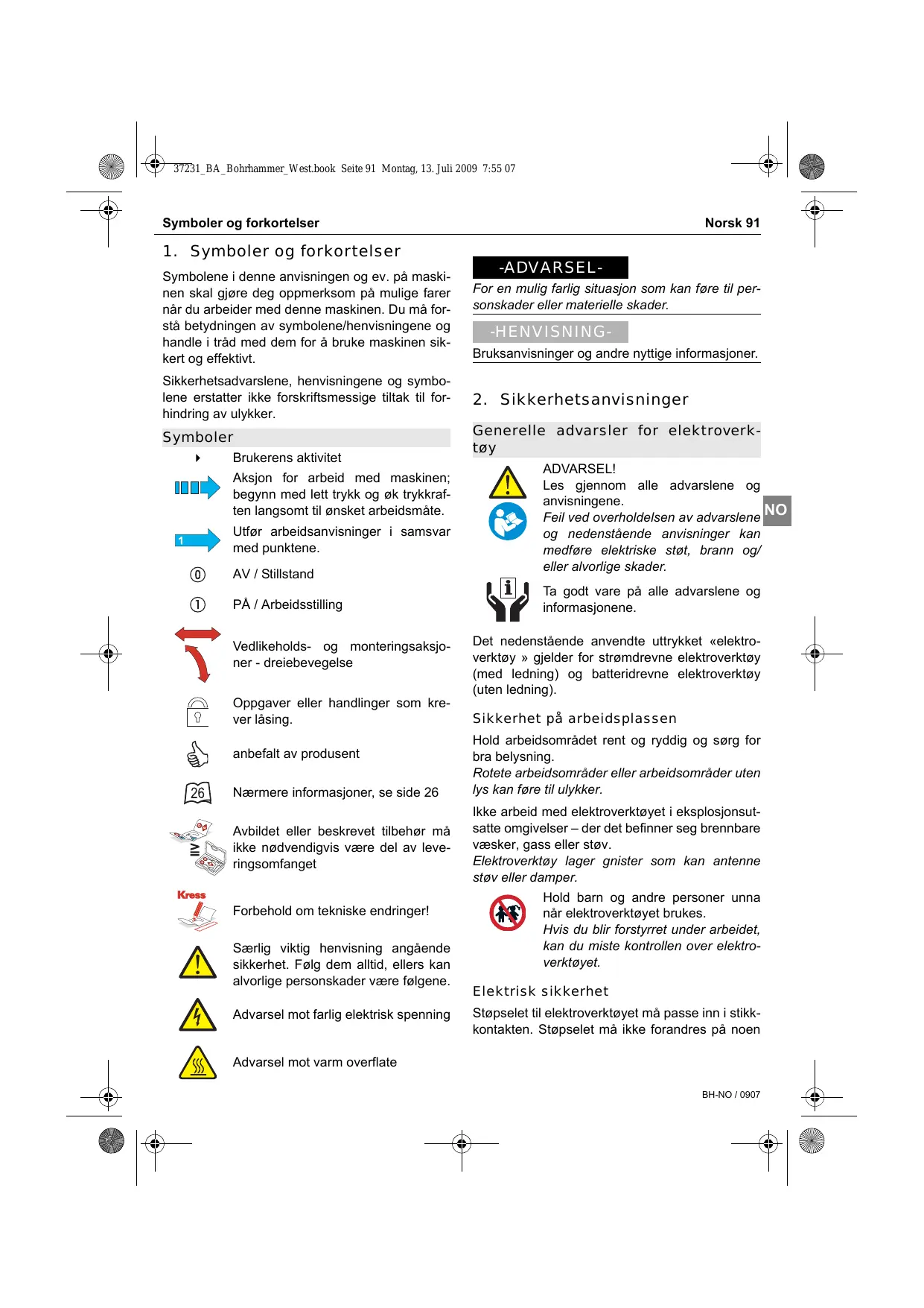 Generelle advarsler for elektroverktøy ADVARSEL! Les gjennom alle advarslene og anvisningene. Feil ved overholdelsen av advarslene og nedenstående anvisninger kan medføre elektriske støt, brann og/ eller alvorlige skader. Ta godt vare på alle advarslene og informasjonene. Det nedenstående anvendte uttrykket «elektroverktøy » gjelder for strømdrevne elektroverktøy (med ledning) og batteridrevne elektroverktøy (uten ledning). Sikkerhet på arbeidsplassen Hold arbeidsområdet rent og ryddig og sørg for bra belysning. Rotete arbeidsområder eller arbeidsområder uten lys kan føre til ulykker. Ikke arbeid med elektroverktøyet i eksplosjonsutsatte omgivelser – der det befinner seg brennbare væsker, gass eller støv. Elektroverktøy lager gnister som kan antenne støv eller damper. Hold barn og andre personer unna når elektroverktøyet brukes. Hvis du blir forstyrret under arbeidet, kan du miste kontrollen over elektroverktøyet. Elektrisk sikkerhet Støpselet til elektroverktøyet må passe inn i stikkkontakten. Støpselet må ikke forandres på noen Advarsel mot varm overflate BH-NO / 0907 37231_BA_Bohrhammer_West.book Seite 92 Montag, 13. Juli 2009 7:55 07 92 Norsk Sikkerhetsanvisninger som helst måte. Ikke bruk adapterstøpsler sammen med jordede elektroverktøy. Bruk av støpsler som ikke er forandret på og passende stikkontakter reduserer risikoen for elektriske støt. Unngå kroppskontakt med jordede overflater slik som rør, ovner, komfyrer og kjøleskap. Det er større fare ved elektriske støt hvis kroppen din er jordet. Hold maskinen unna regn eller fuktighet. Dersom det kommer vann i et elektroverktøy, øker risikoen for elektriske støt. IIkke bruk ledningen til andre formål, f.eks. til å NO bære elektroverktøyet, henge det opp eller trekke det ut av stikkontakten. Hold ledningen unna varme, olje, skarpe kanter eller verktøydeler som beveger seg. Med skadede eller opphopede ledninger øker risikoen for elektriske støt. Når du arbeider utendørs med et elektroverktøy, må du kun bruke en skjøteledning som er egnet til utendørs bruk. Når du bruker en skjøteledning som er egnet for utendørs bruk, reduseres risikoen for elektriske støt. Hvis det ikke kan unngås å bruke elektroverktøyet i fuktige omgivelser, må du bruke en jordfeilbryter. Bruk av en jordfeilbryter reduserer risikoen for elektriske støt. Personsikkerhet Vær oppmerksom, pass på hva du gjør, gå fornuftig frem når du arbeider med et elektroverktøy. Ikke bruk elektroverktøy når du er trett eller er påvirket av narkotika, alkohol eller medikamenter. Et øyeblikks uoppmerksomhet ved bruk av elektroverktøyet kan føre til alvorlige skader. Bruk personlig verneutstyr og husk alltid å bruke vernebriller. Bruk av personlig sikkerhetsutstyr som støvmaske, sklifaste arbeidssko, hjelm eller hørselvern – avhengig av type og bruk av elektroverktøyet – reduserer risikoen for skader. BH-NO / 0907 Unngå å starte verktøyet ved en feiltagelse. Forviss deg om at elektroverktøyet er slått av før du kobler det til strømmen og/eller batteriet, løfter det opp eller bærer det. Hvis du holder fingeren på bryteren når du bærer elektroverktøyet eller kobler elektroverktøyet til strømmen i innkoblet tilstand, kan dette føre til uhell. Fjern innstillingsverktøy eller skrunøkler før du slår på elektroverktøyet. Et verktøy eller en nøkkel som befinner seg i en roterende verktøydel, kan føre til skader. Unngå en unormal kroppsholdning. Sørg for å stå stødig og i balanse. Dermed kan du kontrollere elektroverktøyet bedre i uventede situasjoner. Bruk alltid egnede klær. Ikke bruk vide klær eller smykker. Hold hår, tøy og hansker unna deler som beveger seg. Løstsittende tøy, smykker eller langt hår kan komme inn i deler som beveger seg. Hvis det kan monteres støvavsug- og oppsamlingsinnretninger, må du forvisse deg om at disse er tilkoblet og brukes på korrekt måte. Bruk av et støvavsug reduserer farer på grunn av støv. Omhyggelig bruk og håndtering av elektroverktøy Ikke overbelast verktøyet. Bruk et elektroverktøy som er beregnet til den type arbeid du vil utføre. Med et passende elektroverktøy arbeider du bedre og sikrere i det angitte effektområdet. Ikke bruk elektroverktøy med defekt på-/av-bryter. Et elektroverktøy som ikke lenger kan slås av eller på, er farlig og må repareres. Trekk støpselet ut av stikkontakten og/eller fjern batteriet før du utfører innstillinger på elektroverktøyet, skifter tilbehørsdeler eller legger maskinen bort. Disse tiltakene forhindrer en utilsiktet starting av elektroverktøyet. Elektroverktøy som ikke er i bruk må oppbevares utilgjengelig for barn. Ikke la maskinen brukes av 37231_BA_Bohrhammer_West.book Seite 93 Montag, 13. Juli 2009 7:55 07 Sikkerhetsanvisninger Norsk 93 personer som ikke er fortrolig med dette eller ikke har lest disse anvisningene. Elektroverktøy er farlige når de brukes av uerfarne personer. Vær nøye med vedlikeholdet av elektroverktøyet. Kontroller om bevegelige verktøydeler fungerer feilfritt og ikke klemmes fast, og om deler er brukket eller skadet, slik at dette innvirker på elektroverktøyets funksjon. La disse skadede delene repareres før elektroverktøyet brukes. Dårlig vedlikeholdt elektroverktøy er årsaken til mange uhell. Hold skjæreverktøyene skarpe og rene. Godt stelte skjæreverktøy med skarpe skjær setter seg ikke så ofte fast og er lettere å føre. Bruk elektroverktøy, tilbehør, verktøy osv. i henhold til disse anvisningene. Ta hensyn til arbeidsforholdene og arbeidet som skal utføres. Bruk av elektroverktøy til andre formål enn det som er angitt kan føre til farlige situasjoner. Service Elektroverktøyet ditt skal alltid kun repareres av kvalifisert fagpersonale og kun med originale reservedeler. Slik opprettholdes verktøyets sikkerhet. Maskinspesifikk sjon sikkerhetsinforma- Bruk hørselvern. For stor støybelastning kan føre til hør