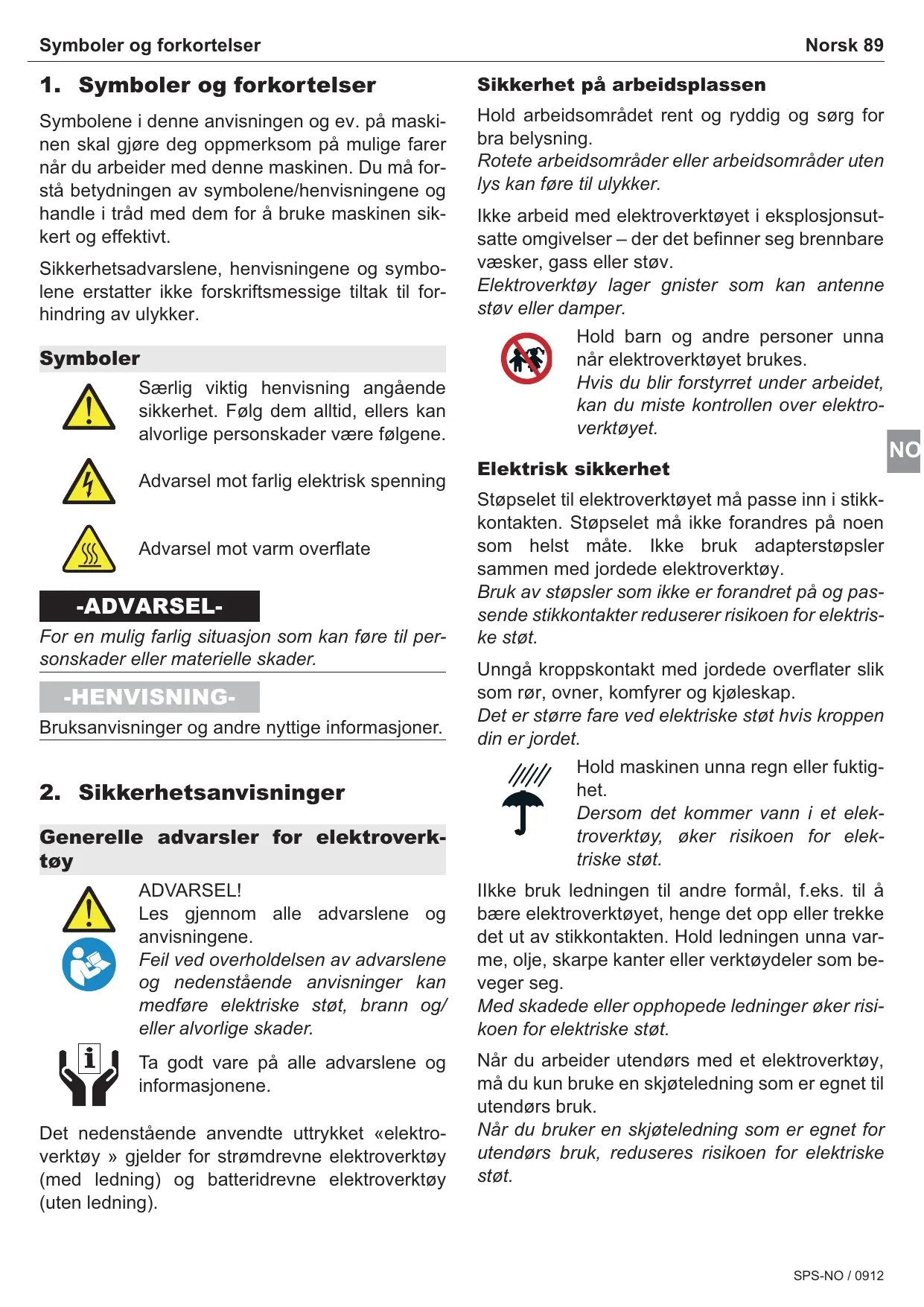 Det nedenstående anvendte uttrykket «elektroverktøy » gjelder for strømdrevne elektroverktøy (med ledning) og batteridrevne elektroverktøy (uten ledning). SPS-NO / 0912 90 Norsk Sikkerhetsanvisninger Hvis det ikke kan unngås å bruke elektroverktøyet i fuktige omgivelser, må du bruke en jordfeilbryter. Bruk av en jordfeilbryter reduserer risikoen for elektriske støt. Personsikkerhet Vær oppmerksom, pass på hva du gjør, gå fornuftig frem når du arbeider med et elektroverktøy. Ikke bruk elektroverktøy når du er trett eller er påvirket av narkotika, alkohol eller medikamenter. Et øyeblikks uoppmerksomhet ved bruk av elektroverktøyet kan føre til alvorlige skader. Bruk personlig verneutstyr og husk alltid å bruke vernebriller. Bruk av personlig sikkerhetsutstyr som støvmaske, sklifaste arbeidssko, hjelm eller hørselvern – avhengig av type og bruk av elektroverktøyet – reduserer risikoen for skader.