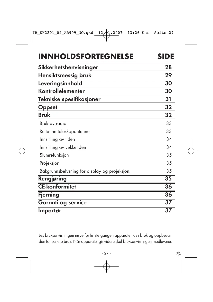Apparatet er egnet for vekking med signallyd og for mottaking av radio-stasjoner. All annen bruk eller modifikasjoner av apparatet gjelder som/DDk forskriftsmessig bruk og kan innebaere stor fare for ulykker.