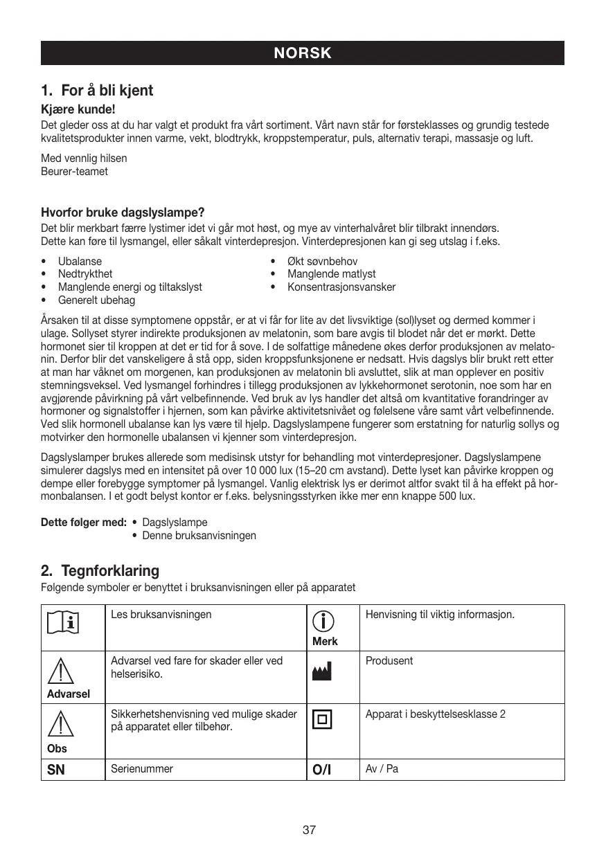 • La lampe à lumière du jour est exclusivement prévue pour l‘irradiation du corps humain. • Avant l‘utilisation, il convient de s‘assurer que l‘appareil et les accessoires ne présentent pas d‘endommagements apparents, et que tous les matériaux d‘emballage sont enlevés. En cas de doute, n‘utilisez pas l‘appareil et adressez-vous à votre revendeur ou reportez-vous à l‘adresse du service aprèsvente indiquée. • Veillez également à une position stable de la lampe à lumière du jour. • Le boîtier de la lampe s‘échauffe pendant le fonctionnement. En cas de contact, il y a danger de brûlure ! Laissez toujours refroidir la lampe avant de la toucher. • La distance à respecter entre des objets inflammables et la lampe à lumière du jour devrait être d‘au moins 1 mètre. • L‘appareil doit uniquement être raccordé à la tension secteur indiquée sur la plaque signalétique. • N‘immergez pas l‘appareil dans l‘eau et ne l‘utilisez pas dans des locaux humides. • N‘utilisez pas l‘appareil sur des personnes dépendantes, des enfants de moins de 3 ans ou des personnes insensibles à la chaleur (personnes ayant des modifications de la peau suite à une maladie), après la prise d‘antalgiques, d‘alcool ou de drogues. • Tenez éloignés les enfants du matériau d‘emballage (danger d‘étouffement !). • À l‘état chaud, l‘appareil ne doit pas être recouvert ni emballé. • Débranchez toujours la fiche secteur et laissez l‘appareil refroidir avant de le toucher. • À l‘état branché, l‘appareil ne doit pas être saisi avec des mains humides; il ne doit pas y avoir de projection d‘eau sur l‘appareil. L‘appareil doit uniquement être utilisé à l‘état entièrement sec. • Tenir le câble d’alimentation éloigné des objets chauds et des flammes nues. • Protégez l‘appareil contre les chocs importants. • Ne débranchez pas de la prise de courant la fiche secteur en tirant sur le câble. • En cas d‘endommagements du câble d‘alimentation et du boîtier, adressez-vous au service après-vente ou au revendeur, étant donné que des outils spéciaux sont nécessaires pour la réparation. • La déconnexion du réseau d‘alimentation n‘est garantie que si la fiche secteur est débranchée de la prise de courant. • Le tube fluorescent de l’appareil contient à l’intérieur une faible quantité de mercure. Si vous cassez un tube fluorescent chez vous, une partie du mercure va s’évaporer sous forme de vapeur de mercure. Dans ce cas, vous devez ouvrir la fenêtre et aérer la pièce pendant environ 5-10 minutes pour respirer le moins possible la vapeur de mercure. • N’utilisez pas cet appareil en présence d’une combinaison de gaz anesthésiant inflammable et d’air, d’oxygène ou d’oxyde d’azote. • Cet appareil ne nécessite pas de calibrage ni de contrôles préventifs, mais vous devez néan- moins l’entretenir. • Vous ne pouvez pas réparer l’appareil. Il ne contient aucune pièce que vous pouvez réparer. • N’effectuez aucune modification sur l’appareil sans autorisation du fabricant. • Lorsque l’appareil est à réparer, des tests et contrôles basiques doivent être effectués pour garantir la sécurité de l’utilisation de l’appareil à l’avenir.