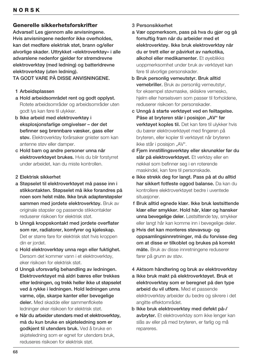 NORSK Generelle sikkerhetsforskrifter Advarsel! Les gjennom alle anvisningene. Hvis anvisningene nedenfor ikke overholdes, kan det medføre elektrisk støt, brann og/eller alvorlige skader. Uttrykket «elektroverktøy» i alle advarslene nedenfor gjelder for strømdrevne elektroverktøy (med ledning) og batteridrevne elektroverktøy (uten ledning). TA GODT VARE PÅ DISSE ANVISNINGENE. 1 Arbeidsplassen a Hold arbeidsområdet rent og godt opplyst. Rotete arbeidsområder og arbeidsområder uten godt lys kan føre til ulykker. b Ikke arbeid med elektroverktøy i eksplosjonsfarlige omgivelser – der det befinner seg brennbare væsker, gass eller støv. Elektroverktøy forårsaker gnister som kan antenne støv eller damper. c Hold barn og andre personer unna når elektroverktøyet brukes. Hvis du blir forstyrret under arbeidet, kan du miste kontrollen. 2 Elektrisk sikkerhet a Støpselet til elektroverktøyet må passe inn i stikkontakten. Støpselet må ikke forandres på noen som helst måte. Ikke bruk adapterstøpsler sammen med jordete elektroverktøy. Bruk av originale støpsler og passende stikkontakter reduserer risikoen for elektrisk støt. b Unngå kroppskontakt med jordete overflater som rør, radiatorer, komfyrer og kjøleskap. Det er større fare for elektrisk støt hvis kroppen din er jordet. c Hold elektroverktøy unna regn eller fuktighet. Dersom det kommer vann i et elektroverktøy, øker risikoen for elektrisk støt. d Unngå uforsvarlig behandling av ledningen. Elektroverktøyet må aldri bæres eller trekkes etter ledningen, og trekk heller ikke ut støpselet ved å rykke i ledningen. Hold ledningen unna varme, olje, skarpe kanter eller bevegelige deler. Med skadde eller sammenflokete ledninger øker risikoen for elektrisk støt. e Når du arbeider utendørs med et elektroverktøy, må du kun bruke en skjøteledning som er godkjent til utendørs bruk. Ved å bruke en skjøteledning som er egnet for utendørs bruk, reduseres risikoen for elektrisk støt.
