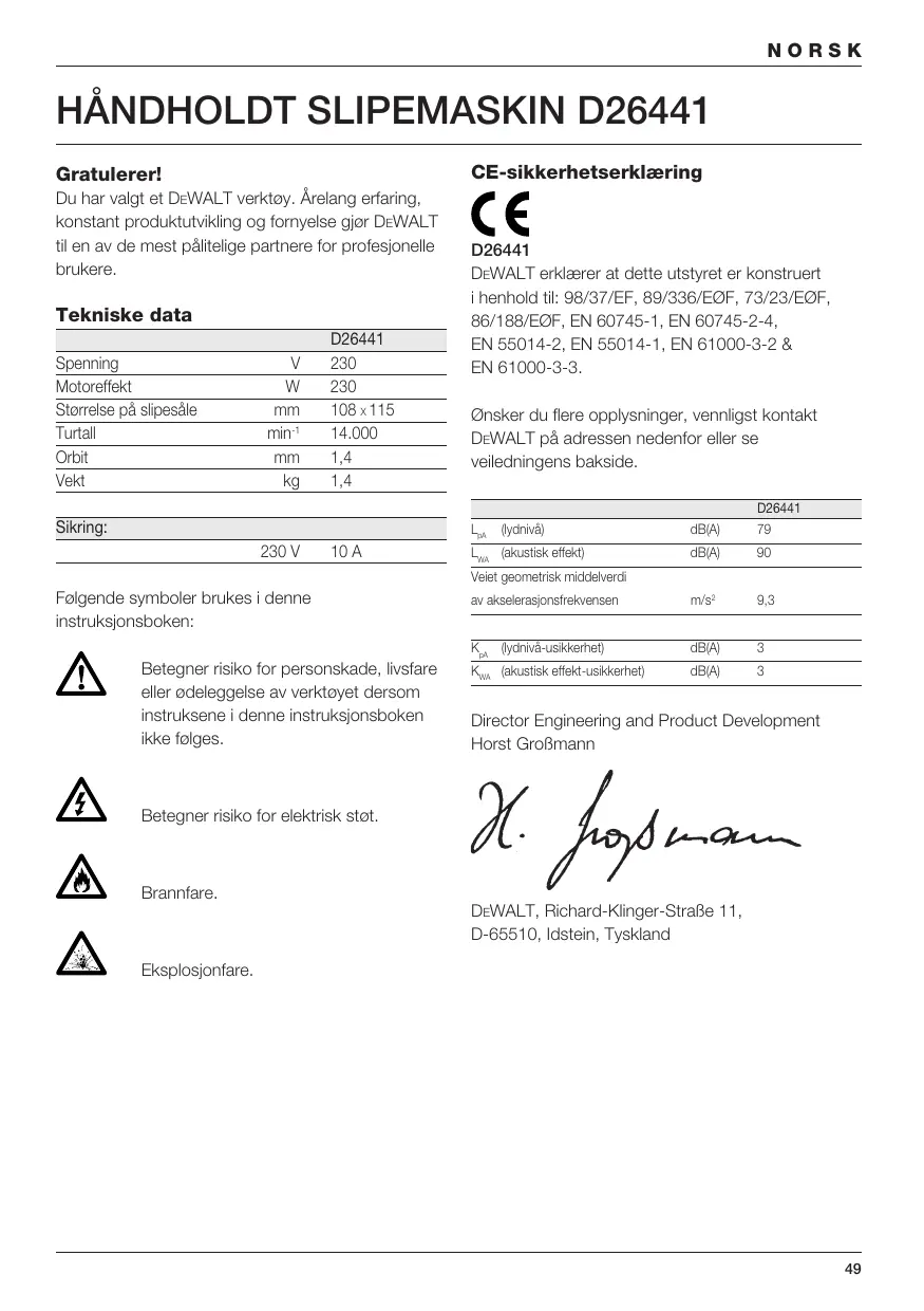 EN 61000-3-2 & EN 61000-3-3. Neem voor meer informatie contact op met DEWALT, zie het adres hieronder of op de achterkant van deze handleiding. D26441 EN 61000-3-3. Ønsker du flere opplysninger, vennligst kontakt DEWALT på adressen nedenfor eller se veiledningens bakside. D26441