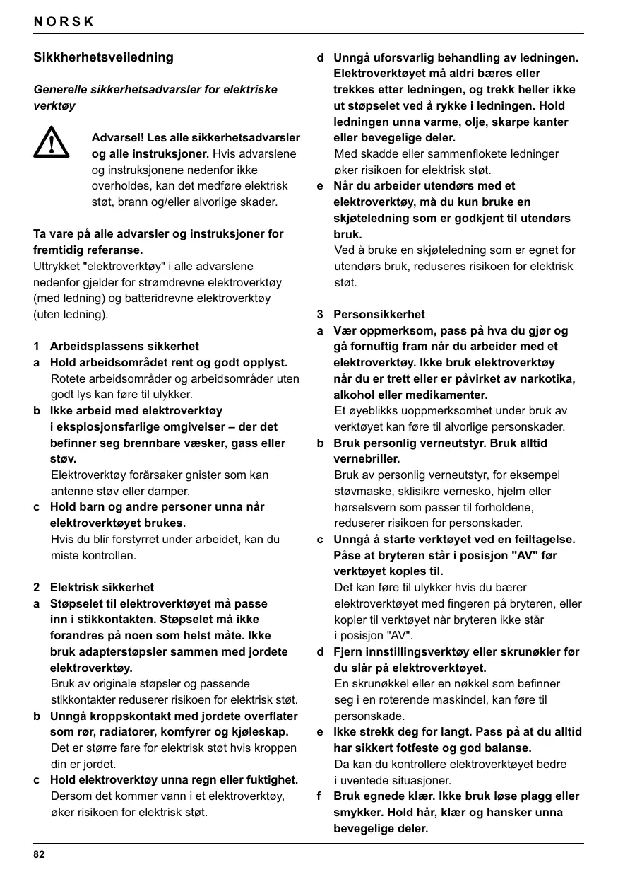 Advarsel! Les alle sikkerhetsadvarsler og alle instruksjoner. Hvis advarslene og instruksjonene nedenfor ikke overholdes, kan det medføre elektrisk støt, brann og/eller alvorlige skader. Ta vare på alle advarsler og instruksjoner for fremtidig referanse. Uttrykket "elektroverktøy" i alle advarslene nedenfor gjelder for strømdrevne elektroverktøy (med ledning) og batteridrevne elektroverktøy (uten ledning). 1 Arbeidsplassens sikkerhet a Hold arbeidsområdet rent og godt opplyst. Rotete arbeidsområder og arbeidsområder uten godt lys kan føre til ulykker. b Ikke arbeid med elektroverktøy i eksplosjonsfarlige omgivelser – der det befinner seg brennbare væsker, gass eller støv. Elektroverktøy forårsaker gnister som kan antenne støv eller damper. c Hold barn og andre personer unna når elektroverktøyet brukes. Hvis du blir forstyrret under arbeidet, kan du miste kontrollen. 2 Elektrisk sikkerhet a Støpselet til elektroverktøyet må passe inn i stikkontakten. Støpselet må ikke forandres på noen som helst måte. Ikke bruk adapterstøpsler sammen med jordete elektroverktøy. Bruk av originale støpsler og passende stikkontakter reduserer risikoen for elektrisk støt. b Unngå kroppskontakt med jordete overflater som rør, radiatorer, komfyrer og kjøleskap. Det er større fare for elektrisk støt hvis kroppen din er jordet. c Hold elektroverktøy unna regn eller fuktighet. Dersom det kommer vann i et elektroverktøy, øker risikoen for elektrisk støt.