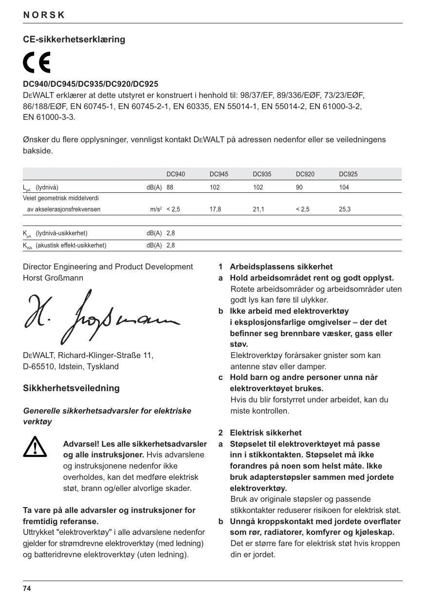 DeWALT erklærer at dette utstyret er konstruert i henhold til: 98/37/EF, 89/336/EØF, 73/23/EØF, 86/188/EØF, EN 60745-1, EN 60745-2-1, EN 60335, EN 55014-1, EN 55014-2, EN 61000-3-2, EN 61000-3-3.