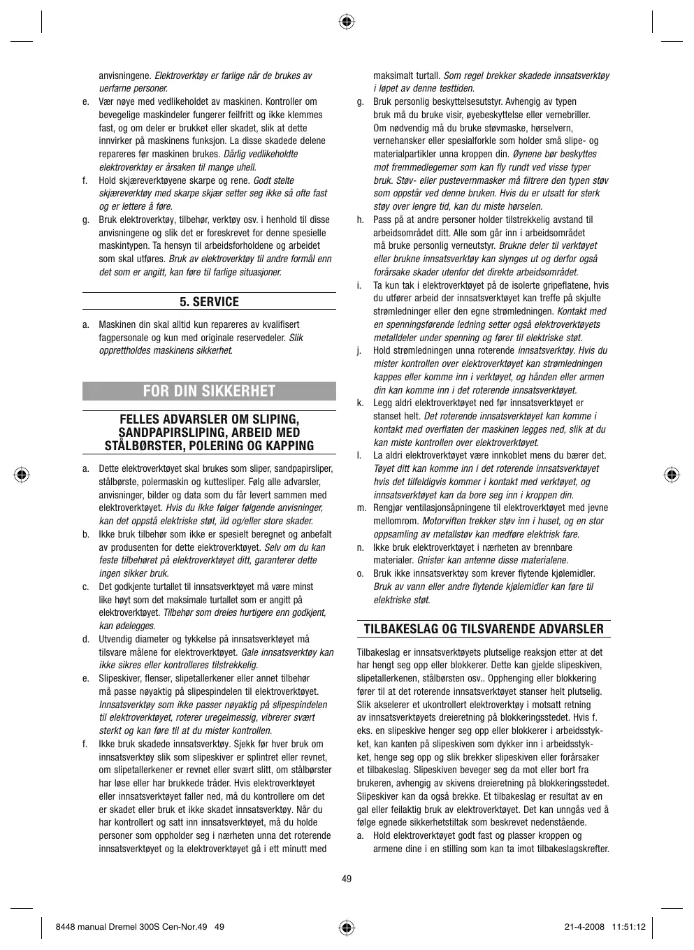 électroportatif dans la direction opposée à la rotation de l’accessoire au point de blocage. Par exemple, si une meule se coince ou se bloque dans la pièce à travailler, le bord de la meule pénétrant au point de blocage peut entamer la surface du matériau et la meule peut ressortir ou être éjectée. En fonction du sens de rotation de la meule au point de blocage, celle-ci peut être projetée vers l’utilisateur ou à l’opposé de celui-ci. Dans ces conditions, les meules peuvent également casser. Le contrecoup résulte d’une utilisation incorrecte de l’outil électroportatif et/ou de mauvaises conditions ou procédures d’utilisation. Ce phénomène peut être évité en prenant les précautions suivantes. a. Maintenez fermement l’outil et campez votre corps et vos bras de manière à résister aux forces de contrecoup. Utilisez systématiquement la poignée supplémentaire, s’il y en a une, pour contrôler au maximum les forces de contrecoup ou le couple de réaction au démarrage. Les forces de contrecoup ou le couple de réaction peuvent être amortis par l’utilisateur si les précautions correctes sont observées. b. Ne placez jamais votre main à proximité de l’accessoire en rotation. Lors d’un contrecoup, l’accessoire risque de rebondir sur celle-ci. c. Ne restez pas dans la zone de contrecoup possible de l’outil électroportatif. Le contrecoup entraînera l’outil dans la direction opposée au mouvement de la meule au point de blocage. d. Soyez extrêmement vigilant lors du travail des coins, arêtes coupantes, etc. Evitez que l’accessoire rebondisse contre la pièce à travailler et qu’il se coince. L’accessoire en rotation a tendance à accrocher au niveau des coins, des arêtes coupantes ou lorsqu’il rebondit, avec une possibilité de perte de contrôle ou de contrecoup. e. N’utilisez pas de lames de scie à chaîne ou dentées. Ce type de lame provoque fréquemment des contrecoups et une perte de contrôle.