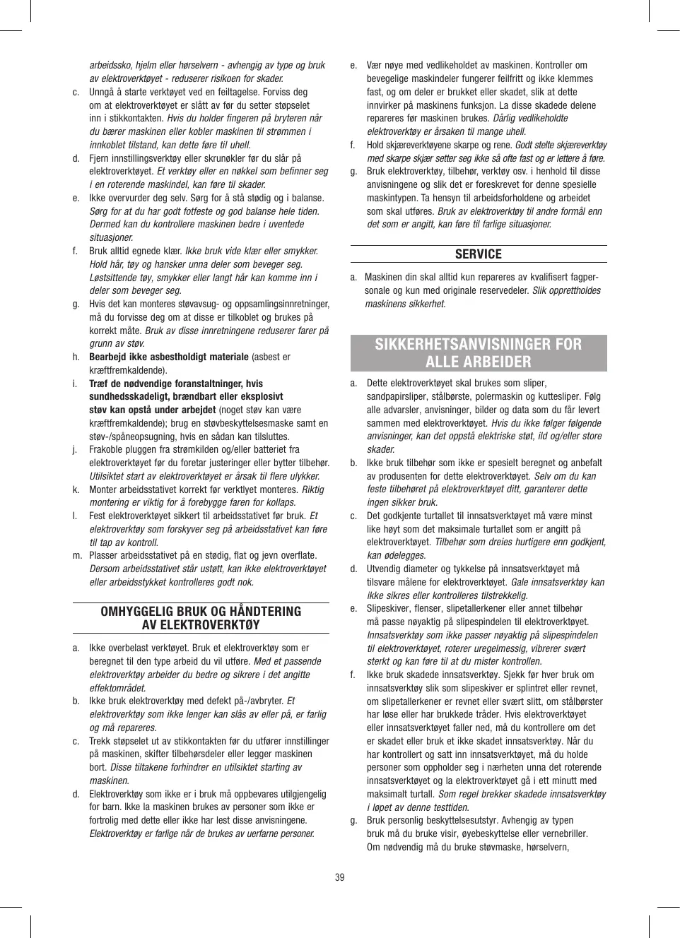 CONSIGNES DE SECURITE SPECIFIQUES POUR LE PONCAGE a. Lors du ponçage, n’utilisez pas un disque abrasif surdimensionné. Respectez les indications du fabricant concernant la feuille abrasive. Les feuilles abrasives trop grandes par rapport au plateau de ponçage présentent un risque de lacération et peuvent provoquer le blocage ou la déchirure du disque abrasif, ou un contrecoup.