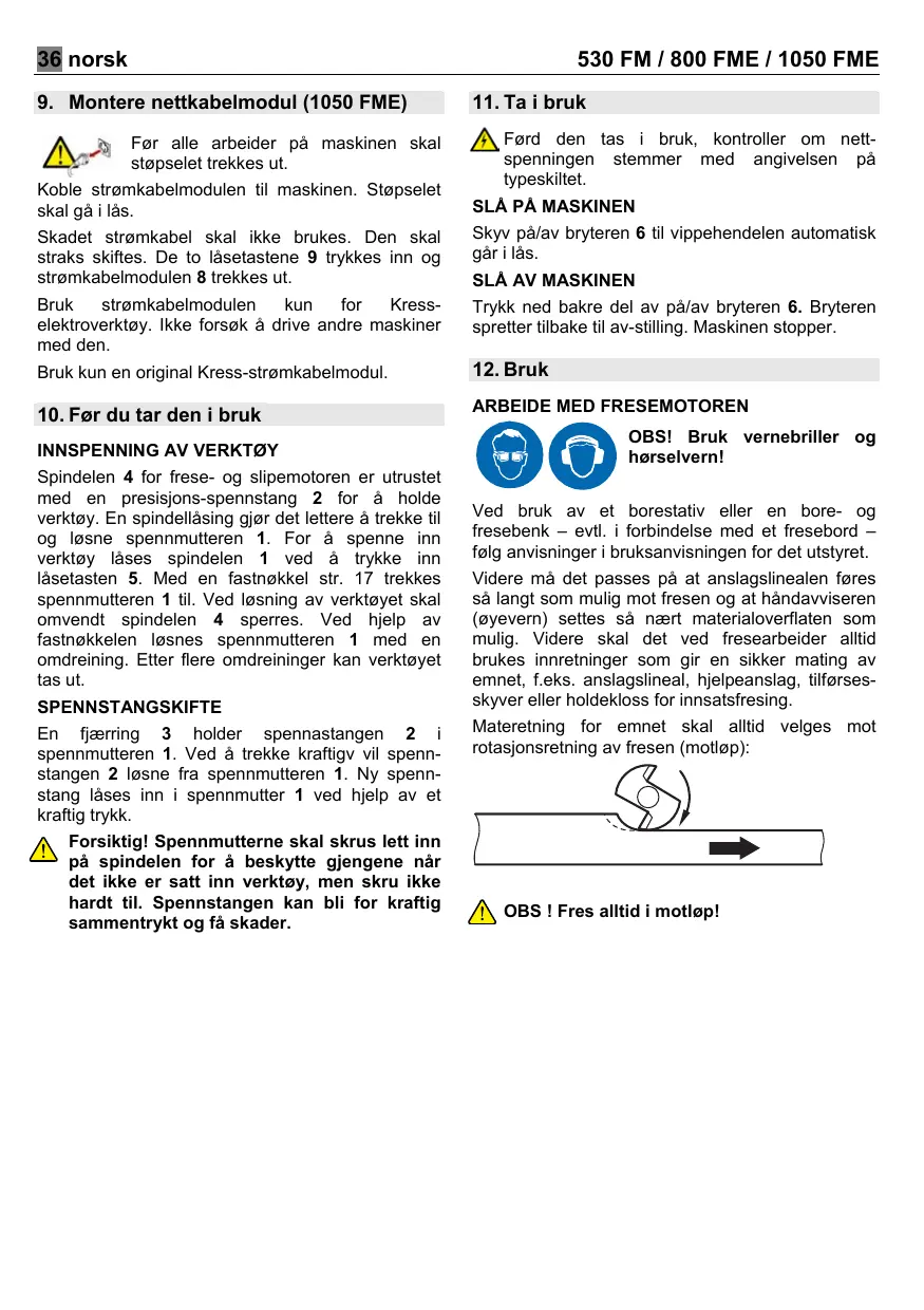 Frese- og slipemotoren er generelt egnet for bruk som overfres i et borestativ eller i en bore- og fresebenk (evntl. i forbindelse med et fresebord), for alle fresearbeider i tre, finerte trevarer og kunststoffer, ved bruk av de foreskrevne freseverktøy. Den egner seg også som håndsliper og som drivverk for høyhastighets fleksible akslinger. Dette apparatet skal kun beyttes til sitt foreskrevne bruk. Uten egnet freseforsats skal motoren ikke føres for hånd. Dette apparatet er produsert i Tyskland av firmaet Kress-Elektrik GmbH & Co.KG. Pass på at freseverktøyene er skarpe. Stumpe verktøy gir ujevne fresearbeider og fører til en unødvendig overbelastning av motoren. Jevn og ikke for kraftig skyving forlenger levetiden av fresen, forhindrer brannflekker på treverket og beskytter motoren mot overbelastning. Det tillatte turtall for verktøyet som brukes må minst være så høyt som maksimalt turtall for frese- og slipemotoren. Pass på at målene på slipeverktøyet passer for sliperen. Slipeskiver må oppbevares og håndteres i nøye samsvar med produsentens anvisninger. Kontroller slipeskiven før bruk, ikke bruk skiver med brudd, sprekker eller andre skader. Adresse: Hechinger Str. 48, D-72406 Bisingen. Pass på at slipeverktøyet anvisningene til produsenten.