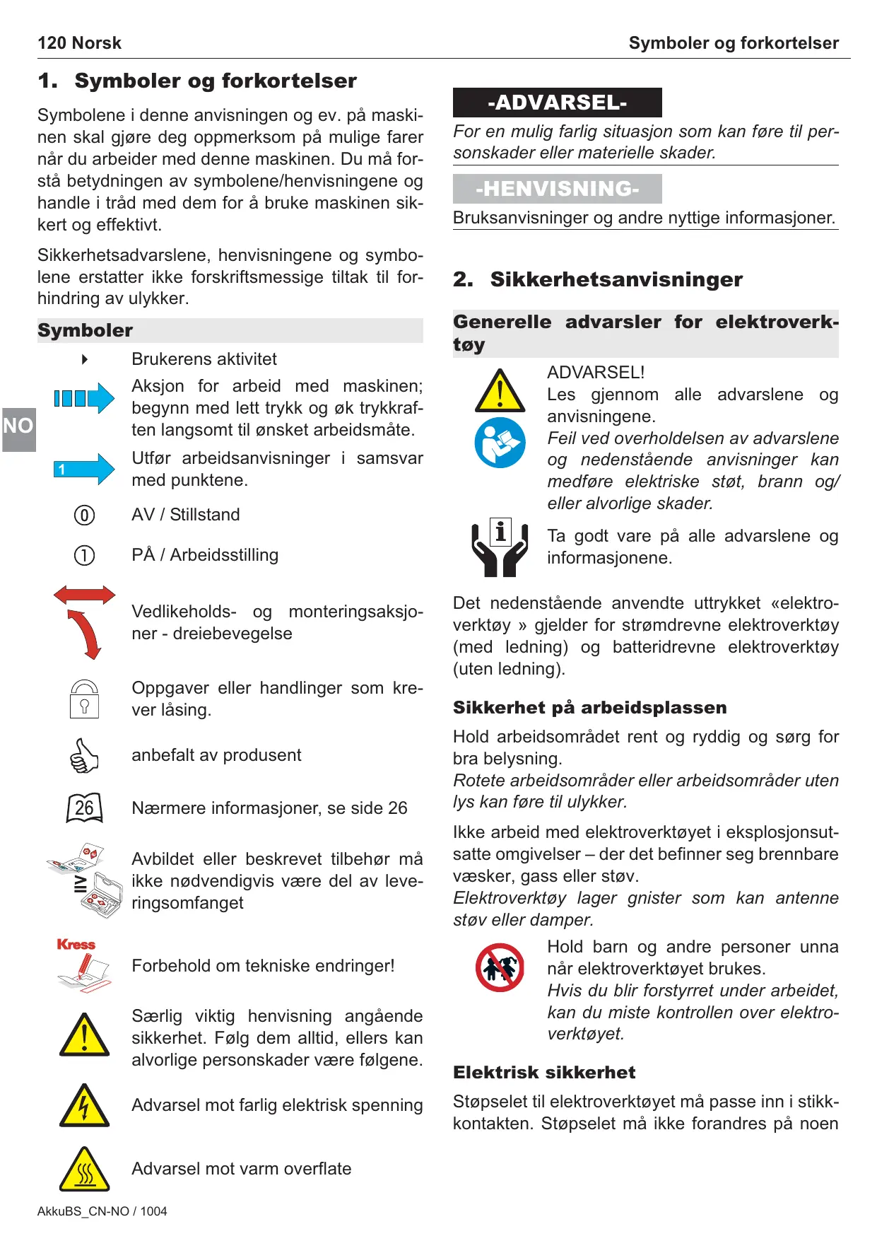 det kiler seg fast i arbeidsstykket som skal bearbeides. Restrisiko. Til tross for at elektroverktøyets bruksanvisning inneholder utførlige anvisninger om sikker arbeidsutføring, har alle elektriske verktøyer en viss restrisiko som ikke kan utelukkes fullstendig, selv med med vernemekanismer. Utvis derfor alltid nødvendig forsiktighet når du bruker slike maskiner! Sikkerhetsanvisninger batterier for oppladbare Du må aldri bruke oppladbare batterier som er defekte eller deformerte. Det er fare for eksplosjoner! Batteriet må ikke åpnes. Det er fare for kortslutning. De oppladbare batteriene må aldri kortsluttes. Det er fare for eksplosjoner! Beskytt batteriet mot varme, f. eks. også mot permanent sollys og ild. Det er fare for eksplosjoner. Ved skader og usakkyndig bruk av batteriet kan det slippe ut damper. Tilfør frisk luft og gå til lege hvis det oppstår helseproblemer. Dampene kan irritere åndedrettsorganene. Ved defekt batteri kan det lekke ut væske som fukter gjenstander i nærheten. Sjekk de aktuelle delene. Rengjør disse eller bytt dem eventuelt ut. Dekk kontaktene på de oppladbare batteriene til ved lagring utenfor ladeapparatet. Det foreligger fare for brann og eksplosjon dersom batteriene kortsluttes på grunn av overslag fra metalliske deler! Sikkerhetsanvisninger for ladeapparat Ikke bruk elektromaskinen dersom nettkabelen er skadet. Ikke berør den skadde kabelen og trekk ut støpselet dersom kabelen blir skadet under arbeid. En skadd kabel øker risikoen for NO elektrisk støt. Ikke bruk maskinen på lett brennbart underlag (f. eks. papir, tekstiler osv.) eller i brennbare omgivelser. Det er fare for brann på grunn av varmen som oppstår. Hold el-apparatet unna regn eller fuktighet. Dersom det kommer vann inn i et ladeapparat, øker risikoen for elektrisk støt. Ikke dekk ventilasjonsåpningene på batteriladeren til mens den lades. Slik vil du unngå at batteriladeren og akkuen overopphetes. Ikke lad opp oppladbare batterier fra andre produsenter. Det elektriske apparatet er kun egnet til opplading av KRESS batterier. Ellers er det fare for brann og eksplosjoner. Hold det elektriske apparatet rent. Smuss fører til fare for elektrisk støt. Før hver bruk må du kontrollere det elektriske apparatet, ledningen og støpselet. Ikke bruk maskinen hvis du registrerer skader. Du må ikke åpne maskinen selv og utelukkende la den repareres av kvalifisert fagperson og kun med originale reservedeler. Skadet maskin, ledning og støpsel øker risikoen for elektriske støt. AkkuBS_CN-NO / 1004 124 Norsk -ADVARSEL- Beskrivelse av maskinen