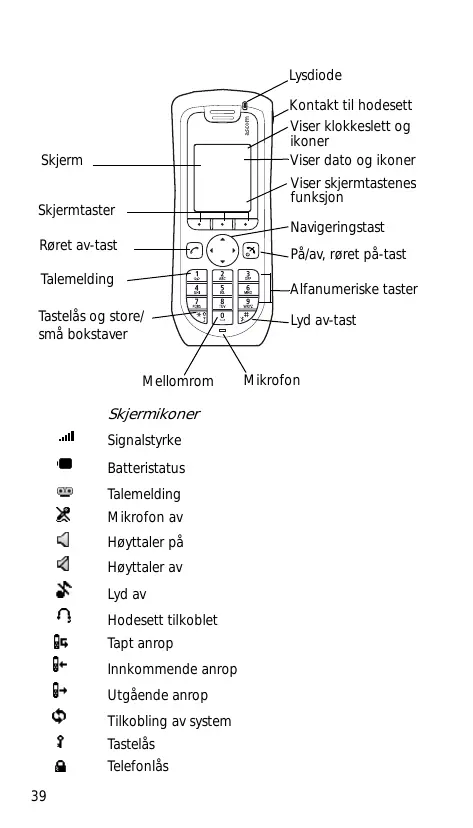 Display LED Headset-stik î Viser tid og ikoner Viser dato og ikoner Softkeys Loft roret Telefonsvarer —— Testaturlès og store/smè bogstaver