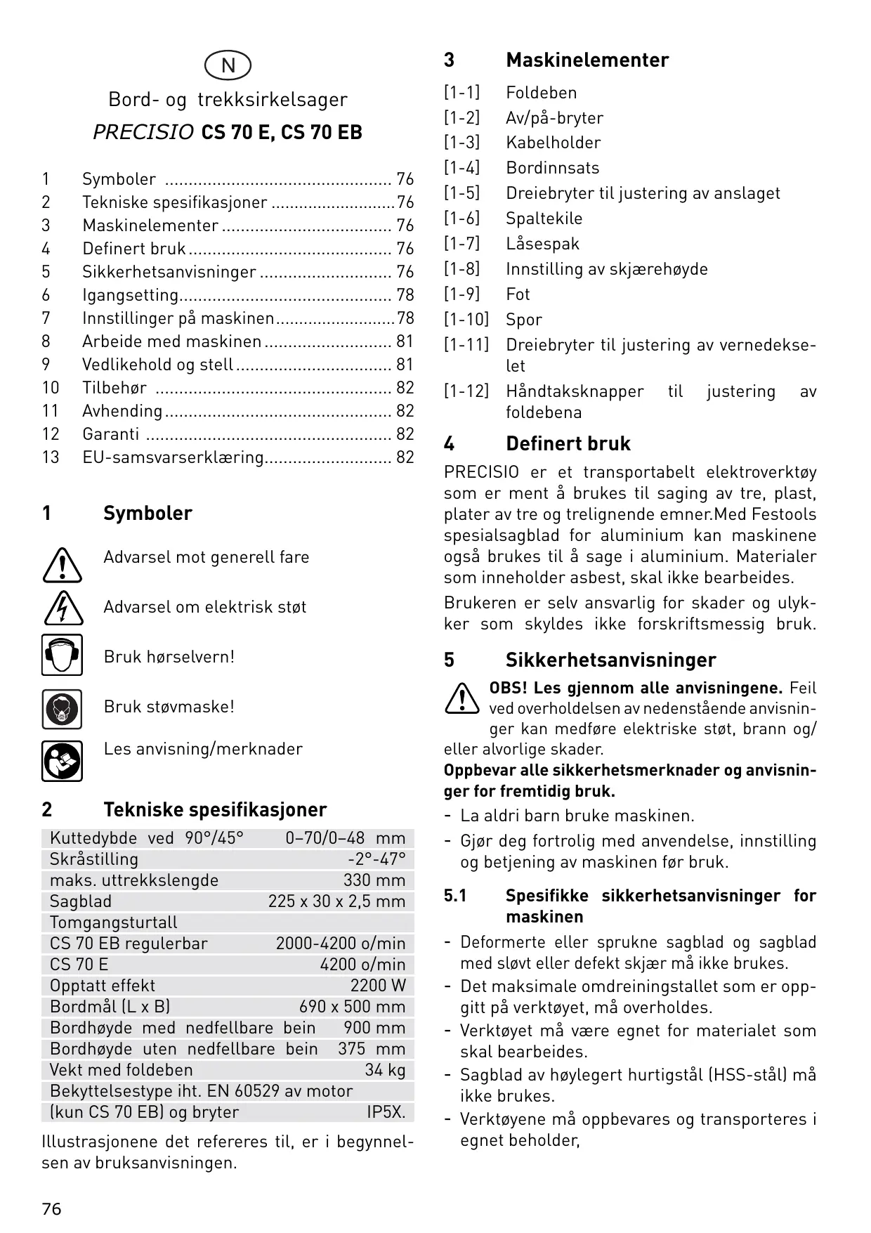 Tekniske spesifikasjoner Kuttedybde ved 90°/45° 0–70/0–48 mm Skråstilling -2°-47° maks. uttrekkslengde 330 mm Sagblad 225 x 30 x 2,5 mm Tomgangsturtall CS 70 EB regulerbar 2000-4200 o/min CS 70 E 4200 o/min Opptatt effekt 2200 W Bordmål (L x B) 690 x 500 mm Bordhøyde med nedfellbare bein 900 mm Bordhøyde uten nedfellbare bein 375 mm Vekt med foldeben 34 kg Bekyttelsestype iht. EN 60529 av motor (kun CS 70 EB) og bryter IP5X. Illustrasjonene det refereres til, er i begynnelsen av bruksanvisningen.