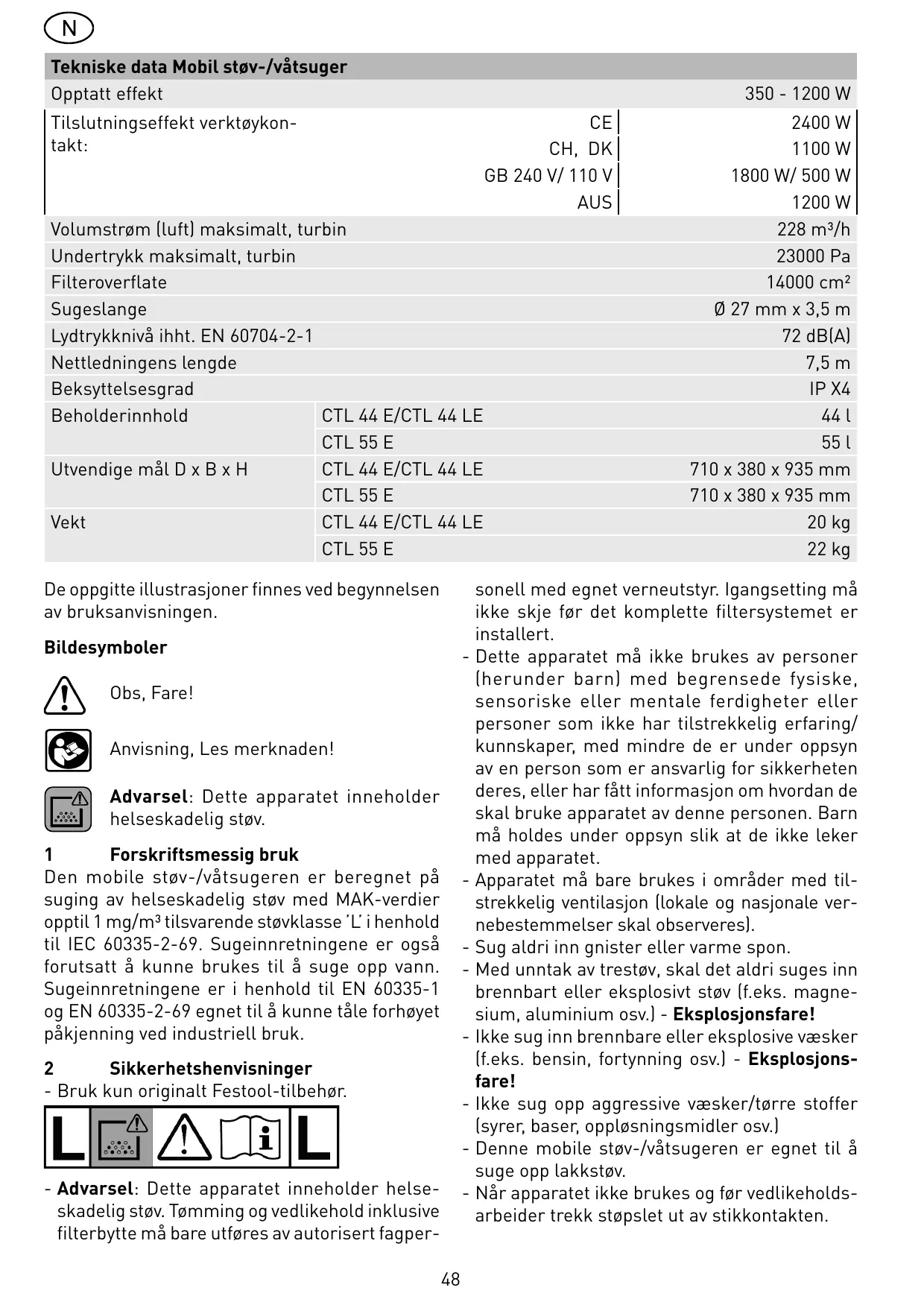 CTL 55 E De oppgitte illustrasjoner finnes ved begynnelsen av bruksanvisningen. 2400 W 1100 W 1800 W/ 500 W 1200 W 228 m³/h 23000 Pa 14000 cm² Ø 27 mm x 3,5 m 72 dB(A) 7,5 m IP X4 44 l 55 l 710 x 380 x 935 mm 710 x 380 x 935 mm 20 kg 22 kg sonell med egnet verneutstyr. Igangsetting må ikke skje før det komplette filtersystemet er installert. - Dette apparatet må ikke brukes av personer (herunder barn) med begrensede fysiske, sensoriske eller mentale ferdigheter eller personer som ikke har tilstrekkelig erfaring/ kunnskaper, med mindre de er under oppsyn av en person som er ansvarlig for sikkerheten deres, eller har fått informasjon om hvordan de skal bruke apparatet av denne personen. Barn må holdes under oppsyn slik at de ikke leker med apparatet. - Apparatet må bare brukes i områder med tilstrekkelig ventilasjon (lokale og nasjonale vernebestemmelser skal observeres). - Sug aldri inn gnister eller varme spon. - Med unntak av trestøv, skal det aldri suges inn brennbart eller eksplosivt støv (f.eks. magnesium, aluminium osv.) - Eksplosjonsfare! - Ikke sug inn brennbare eller eksplosive væsker (f.eks. bensin, fortynning osv.) - Eksplosjonsfare! - Ikke sug opp aggressive væsker/tørre stoffer (syrer, baser, oppløsningsmidler osv.) - Denne mobile støv-/våtsugeren er egnet til å suge opp lakkstøv. - Når apparatet ikke brukes og før vedlikeholdsarbeider trekk støpslet ut av stikkontakten. Bildesymboler Obs, Fare! Anvisning, Les merknaden! Advarsel: Dette apparatet inneholder helseskadelig støv. Forskriftsmessig bruk Den mobile støv-/våtsugeren er beregnet på suging av helseskadelig støv med MAK-verdier opptil 1 mg/m³ tilsvarende støvklasse ’L’ i henhold til IEC 60335-2-69. Sugeinnretningene er også forutsatt å kunne brukes til å suge opp vann. Sugeinnretningene er i henhold til EN 60335-1 og EN 60335-2-69 egnet til å kunne tåle forhøyet påkjenning ved industriell bruk. Sikkerhetshenvisninger - Bruk kun originalt Festool-tilbehør. - Advarsel: Dette apparatet inneholder helseskadelig støv. Tømming og vedlikehold inklusive filterbytte må bare utføres av autorisert fagper48 Før bryteren stilles til “Auto” må det kontrolleres at apparatet som er tilkoplet er slått av. Støvsugerens motor starter når verktøyet som er tilkoplet slåes på. - Ta ikke i kabelen mens du trekker ut stikkontakten. - Beskytt kabelen mot varme, olje og skarpe kanter. - Kontrollér regelmessig støpsel og kabel, og hvis disse er skadde la de fornyes av en fagmann. - Apparatene må ikke utsettes for regn. - Apparatet må ikke løftes og transporteres på håndtaket ved hjelp av krankrok eller løfteinnretning. - Apparatet må bare benyttes av personer som er opplært for håndtering av apparatet og som har fått i oppdrag å benytte dette. - Er sunnhetsskadelig støv suget opp, skal sugeren og alt tilbehør rengjøres helt inn- og utvendig ved støvsuging og avtørking før fjerning fra det forurensede området. Deler som ikke kan rengjøres fullstending, skal pakkes og forsegles lufttett i plast for transport. - Av sikkerhetsgrunner må maskinen bare kobles til jordet stikkontakt.