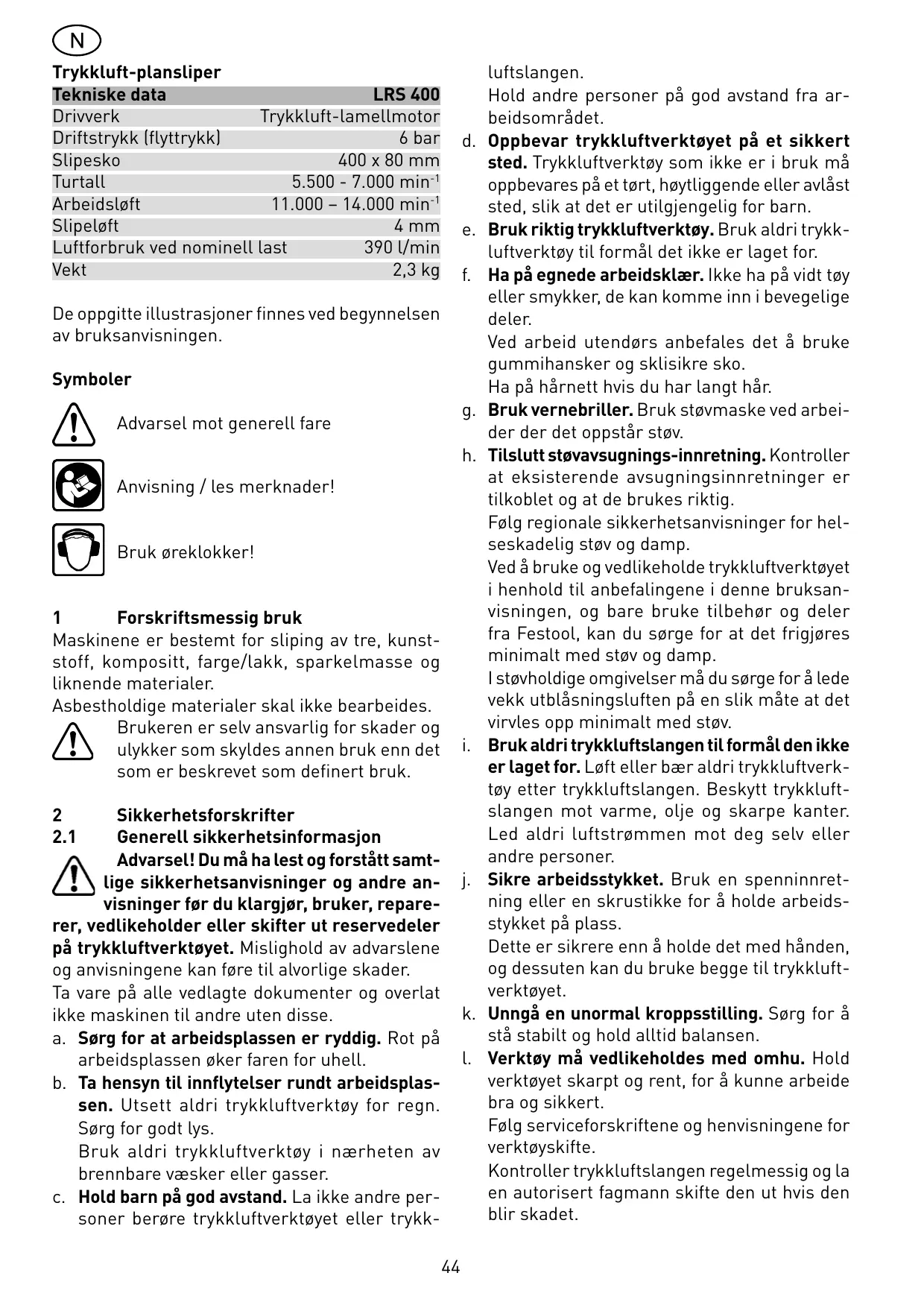 - En cas de poussières explosives ou auto-inflammables dues au ponçage, il faut absolument respecter les indications du fabricant du matériau concernant l’usinage. - Si le ponçage dégage des poussières malsaines, l’outil doit être raccordé à un dispositif d’aspiration approprié et les prescriptions de sécurité applicable à cette substance doivent être respectées. - La pression de service ne doit pas dépasser 6,5 bars. - Cet outil doit être utilisé uniquement avec du papier abrasif. Les meules ou les disques à tronçonner ne sont pas admis. - Travaillez uniquement avec de l’air comprimé correctement traité. Ceci est assuré si vous utilisez l’unité de conditionnement Festool VE. - N’utiliser que des accessoires d’origine Festool. 16