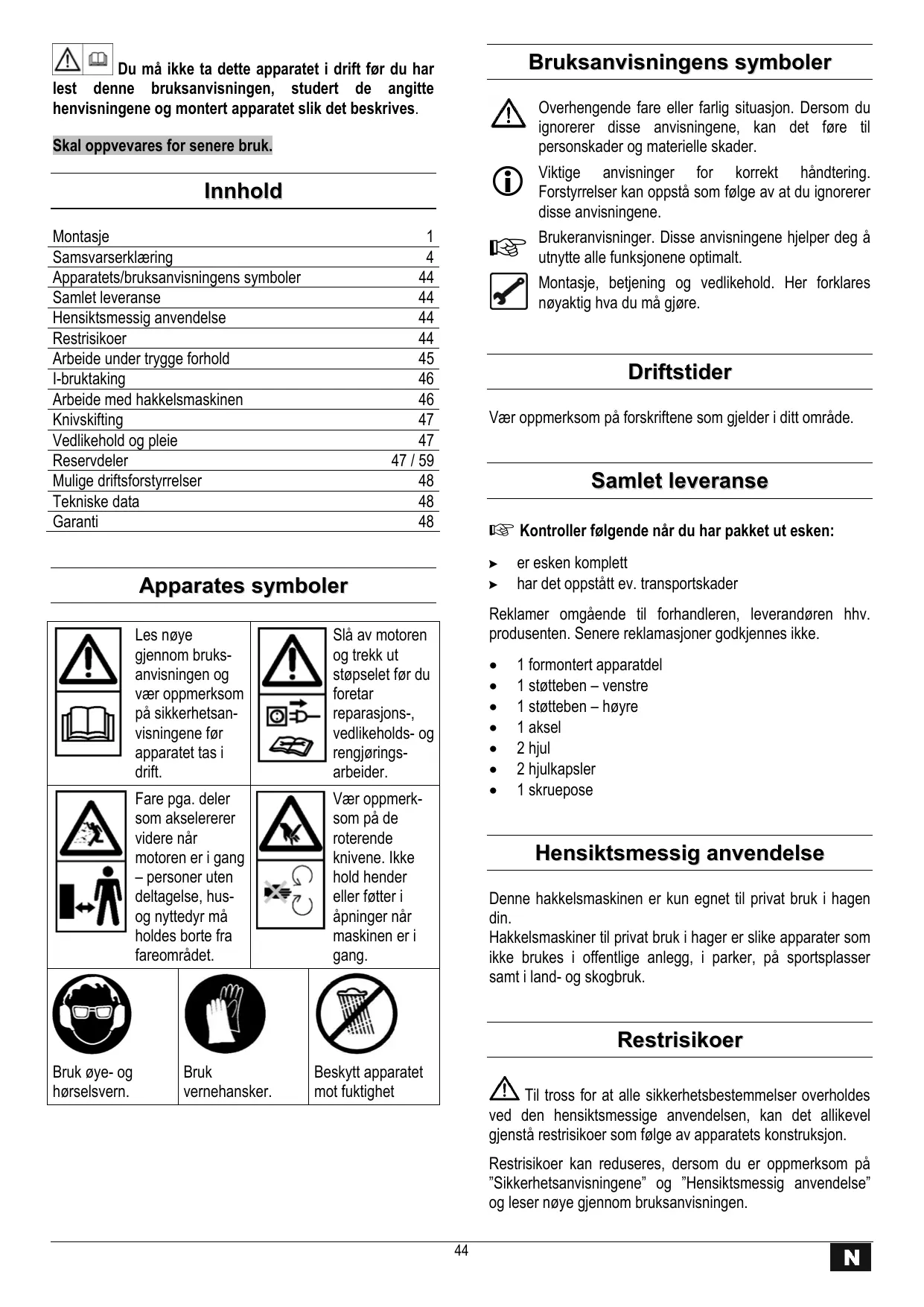 - Ikke bruk apparatet til formal som det ikke konstrukiert for (se "Hensiktsmessig anvendelse" og "Arbeide med hakkelsmaskinen").