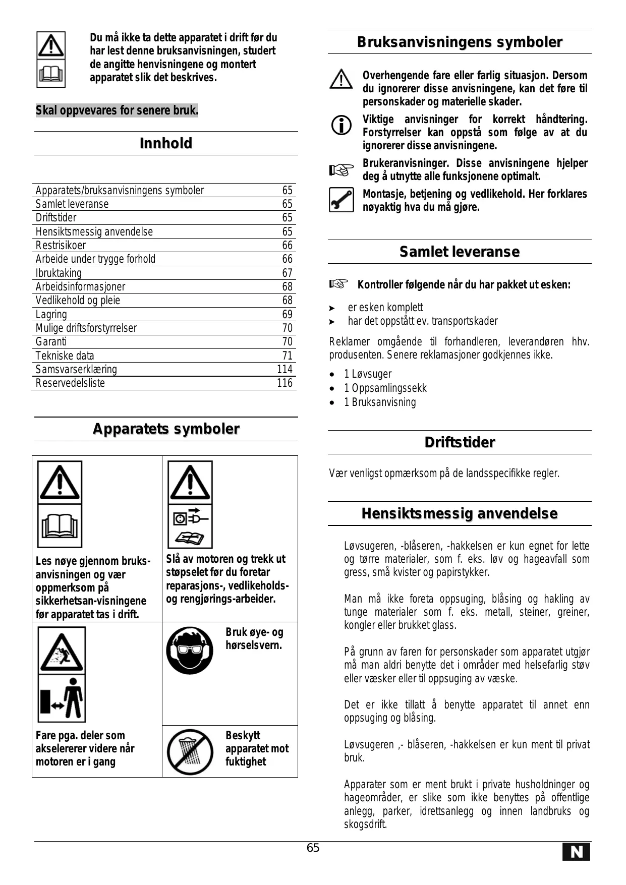 Til riktig bruk hører også at man må overholde produsentens drifts-, vedlikeholds- og reparasjonsbetingelser og overholdelse av sikkerhetsinformasjonene i anvisningen. Man må overholde de gjeldene forskriftene for ang. skadeforebygging og det andre allment anerkjente regelverket for arbeidsmedisin og sikkerhetsteknikk. Hvis man foretar selvstendige endringer på Løvsuger frafaller produsentens ansvar for alle skader som oppstår på grunn av dette. Løvsuger må kun klargjøres, benyttes og vedlikeholdes av personer som kjenner disse oppgavene og som er kjenner farene de utsettes for. Reparasjonsarbeid må kun gjennomføres av oss eller av kundeservicesteder som er anbefalt av oss. Maskinen må ikke benyttes i områder med eksplosjonsfare eller utsettes for regn.