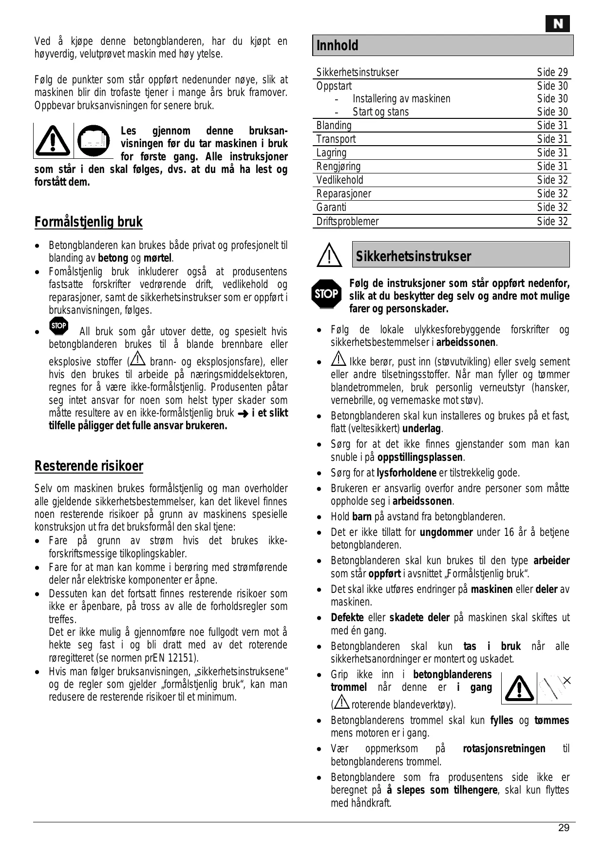 Ved à kjope denne betongblanderen, har du kjept en hoyverdig, velutpravet maskin med hgy ytelse. Folg de punkter som stèr oppfart nedenunder naye, slik at maskinen blir din trofaste tjener i mange àrs bruk framover. Oppbevar bruksanvisningen for senere bruk. Les gjennom denne bruksan- visningen for du tar maskinen i bruk for forste gang. Alle instruksjoner som stär i den skal folges, dvs. at du mà ha lest og forstätt dem. Formälstjenlig bruk + Betongblanderen kan brukes bâde privat og profesjonelt til blanding av betong og mortel. e Fomälstenlig bruk inkluderer ogsè at produsentens fastsatte forskrifter vedrarende drift vedlikehold og reparasjoner, samt de sikkerhetsinstrukser som er oppfart i bruksanvisningen, falges. . [or] All bruk som gér utover dette, og spesielt his betongblanderen brukes til à blande brennbare eller eksplosive stoffer (ZA brann- og eksplosjonsfare), eller hvis den brukes til arbeide pà næringsmiddelsektoren, regnes for à være ikke-formälstjenlig. Produsenten pâtar seg intet ansvar for noen som helst typer skader som mâtte resultere av en ikke-formälstjenlig bruk => i et slikt tilfelle päligger det fulle ansvar brukeren. Resterende risikoer Selv om maskinen brukes formälstienlig og man overholder alle gjeldende sikkerhetsbestemmelser, kan det likevel finnes noen resterende risikoer pà grunn av maskinens spesielle konstruksjon ut fra det bruksformäl den skal tjene: e Fare pà grunn av stym hvis det brukes ikke- forskriftsmessige tilkoplingskabler. e Fare for at man kan komme i bergring med strymfgrende deler när elektriske komponenter er àpne. e Dessuten kan det fortsatt finnes resterende risikoer som ikke er épenbare, pà tross av alle de forholdsregler som treffes. Det er ikke mulig à gjennomfgre noe fullgodt ven mot à hekte seg fast i og bli dratt med av det roterende raregitteret (se normen prEN 12151). e Hvis man fglger bruksanvisningen, ,sikkerhetsinstruksene" og de regler som gjelder ,formälstjenlig bruk", kan man redusere de resterende risikoer til et minimum. Innhold Sikkerhetsinstrukser Side 29 Oppstart Side 30 - _Installering av maskinen Side 30 -__ Startog stans Side 30 Blanding Side 31 Transport Side 31 Lagring Side 31 Rengjgring Side 31 Vedlikehold Side 32 Reparasjoner Side 32 Garanti Side 32 Driftsproblemer Side 32 /\ (Sikkerhetsinstrukser © Folg de instruksjoner som stär oppfort nedenfor, slik at du beskytter deg selv og andre mot mulige “ farer og personskader. e Folg de lokale ulykkesforebyggende forskrifter og sikkerhetsbestemmelser i arbeidssonen. . À Ikke bergr, pust inn (stavutvikling) eller svelg sement eller andre tilsetningsstoffer. Nr man fyller og tümmer blandetrommelen, bruk personlig verneutstyr (hansker, vernebrille, og vememaske mot stav). + Betongblanderen skal kun installeres og brukes pè et fast, flatt (veltesikkert) underlag. e Sorg for at det ikke finnes gjenstander som man kan snuble i pà oppstillingsplassen. e_ Sorg for at lysforholdene er tilstrekkelig gode. + Brukeren er ansvarlg overfor andre personer som mâtte oppholde seg i arbeidssonen. + Hold barn pé avstand fra betongblanderen. + Det er ikke tillatt for ungdommer under 16 är à betjene betongblanderen. e Betongblanderen skal kun brukes til den type arbeider som stèr oppfart i avsnittet ,Formälstienlig bruk". + Det skal ikke utfgres endringer pà maskinen eller deler av maskinen. + Defekte eller skadete deler pà maskinen skal skiftes ut med én gang. e Betongblanderen skal kun tas i bruk sikkerhetsanordninger er montert og uskadet. e Grip ikke inn i betongblanderens \X trommel nèr denne er i gang \: VAN roterende blandeverktay). + Betongblanderens trommel skal kun fylles og tommes mens motoren er i gang. e Vær oppmerksom pà betongblanderens trommel. e Betongblandere som fra produsentens side ikke er beregnet pè à slepes som tilhengere, skal kun fiyttes med händkraft. nèr alle rotasjonsretningen til