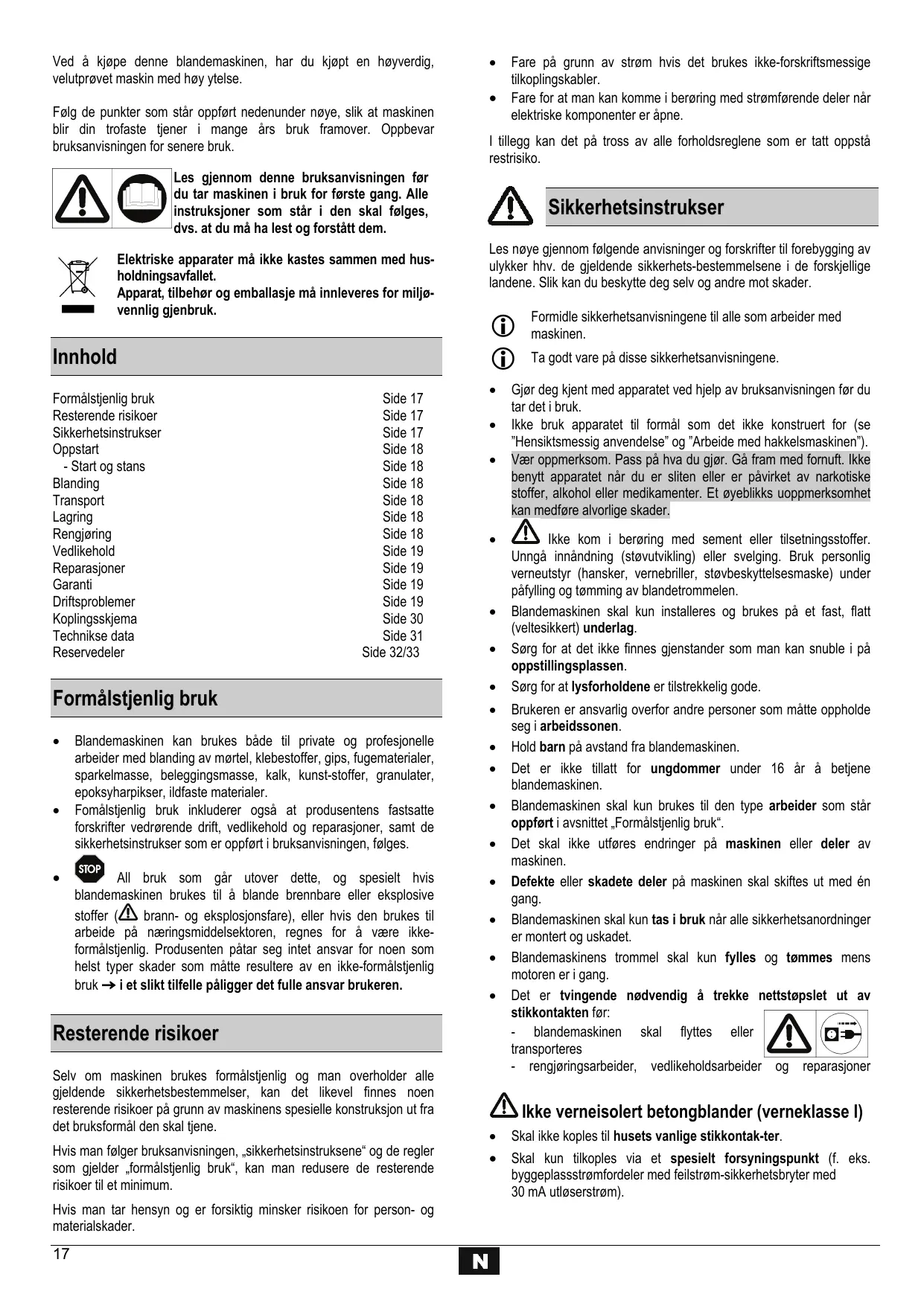 Fare på grunn av strøm hvis det brukes ikke-forskriftsmessige tilkoplingskabler. Fare for at man kan komme i berøring med strømførende deler når elektriske komponenter er åpne. I tillegg kan det på tross av alle forholdsreglene som er tatt oppstå restrisiko. Les gjennom denne bruksanvisningen før du tar maskinen i bruk for første gang. Alle instruksjoner som står i den skal følges, dvs. at du må ha lest og forstått dem. Elektriske apparater må ikke kastes sammen med husholdningsavfallet. Apparat, tilbehør og emballasje må innleveres for miljøvennlig gjenbruk. Innhold Formålstjenlig bruk Resterende risikoer Sikkerhetsinstrukser Oppstart - Start og stans Blanding Transport Lagring Rengjøring Vedlikehold Reparasjoner Garanti Driftsproblemer Koplingsskjema Technikse data Reservedeler Side 17 Side 17 Side 17 Side 18 Side 18 Side 18 Side 18 Side 18 Side 18 Side 19 Side 19 Side 19 Side 19 Side 30 Side 31 Side 32/33 Formålstjenlig bruk