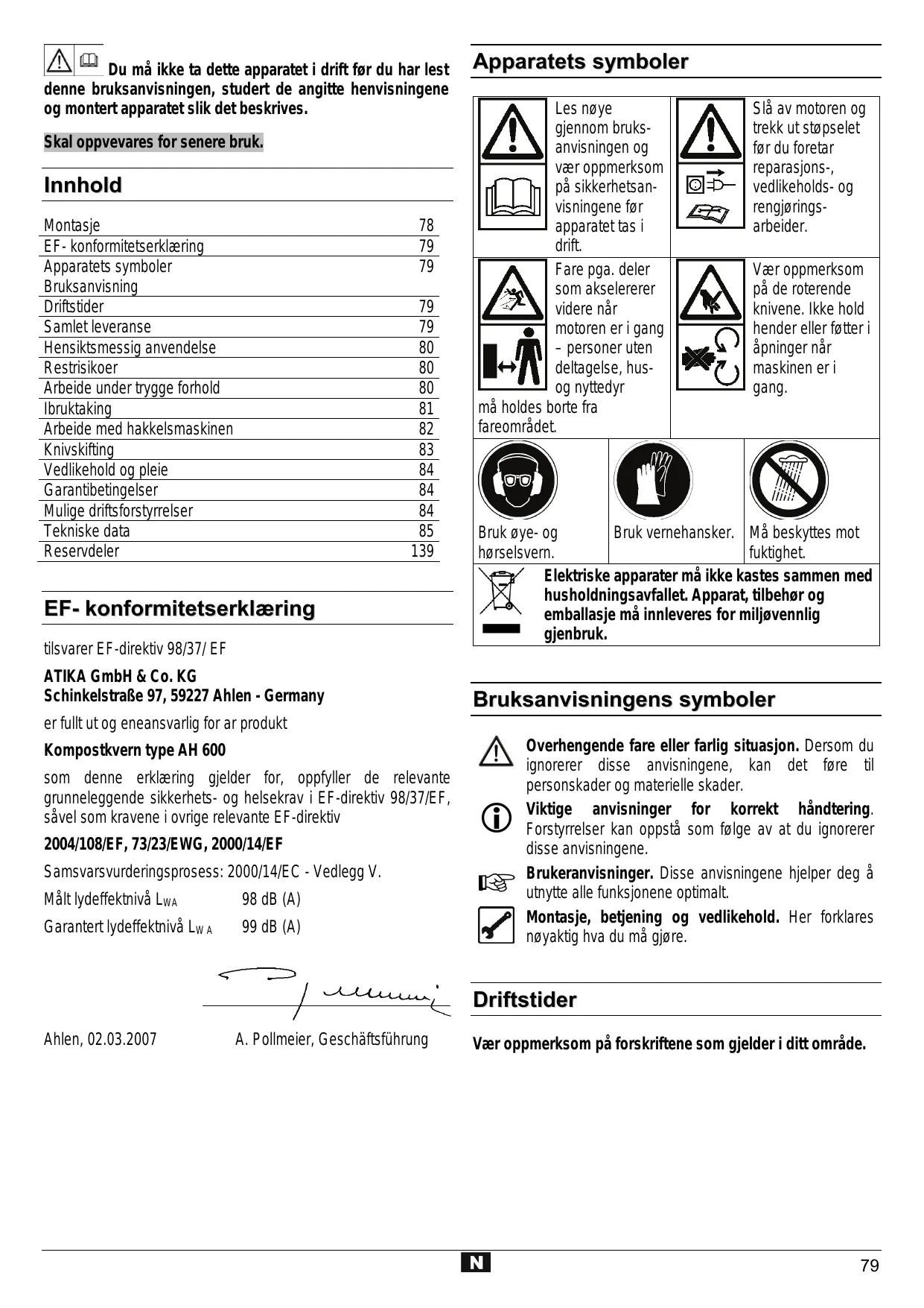 | Garantert lydeffektnivå LWA(målt i henhold til direktivet 2000/14/EF) | 92 dB (A) | 92 dB (A) | 92 dB (A) |