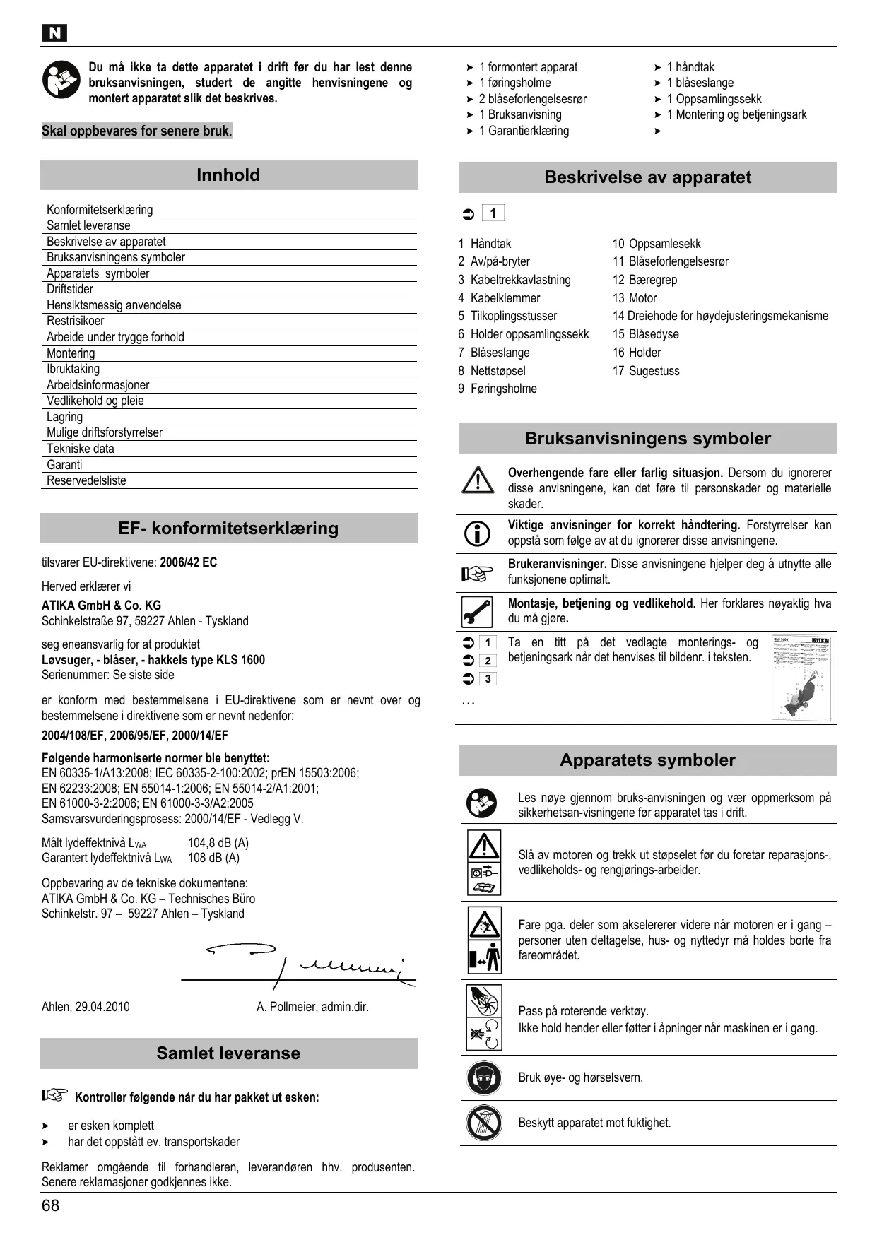 2004/08/EF, 2006/95/EF, 2000/14/EF Folgende harmoniserte normer ble benyttet: