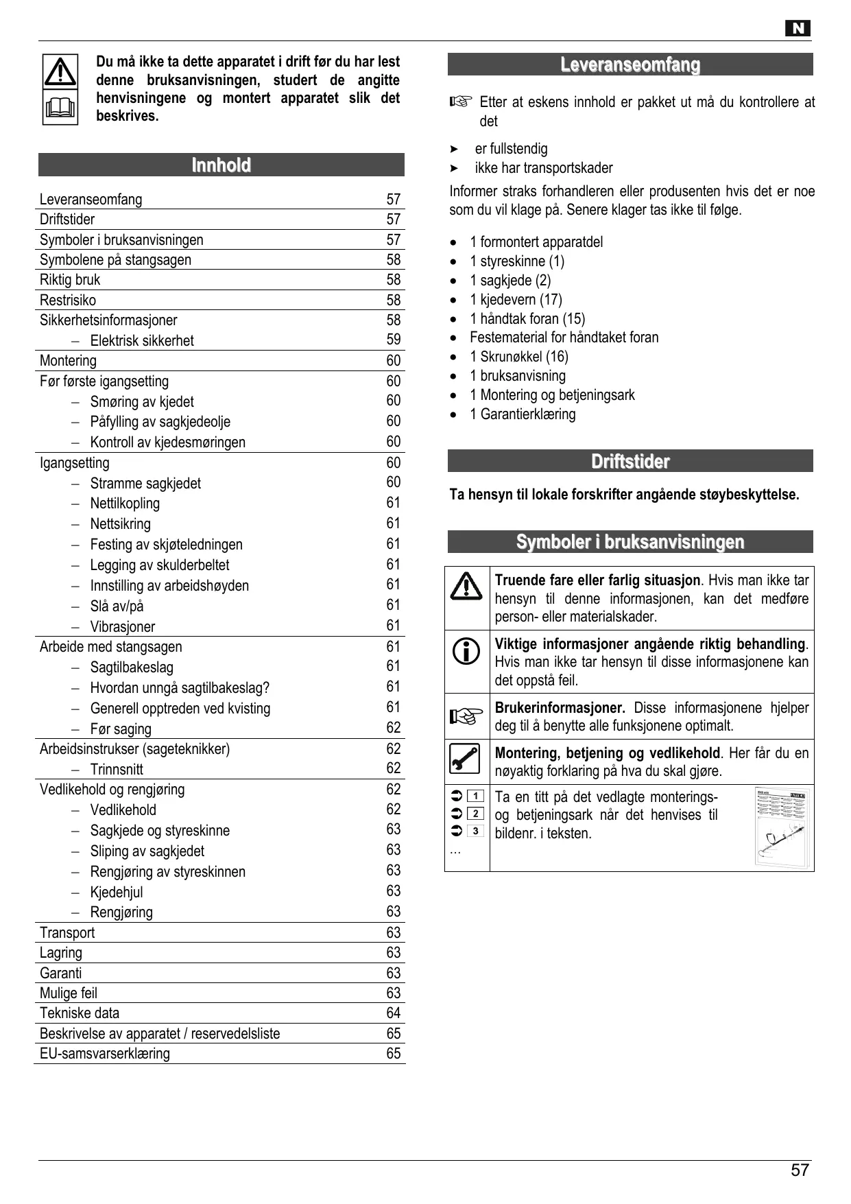 À Denne sagen er ikke ment brukt av personer (inkludert (6) barn) med begrensete fysiske, sensoriske eller mentale evner eller som mangler erfaring og/eller kunnskaper med mindre de fàr hjelp av en person som er ansvarlig for deres sikkerhet eller har fàtt opplæring i bruk av sagen. Du mà kun gi eller läne bort stangsagen til personer som kjenner stangsagen og vet hvordan den skal händteres. Formidle sikkerhetsanvisningene til alle som arbeider med maskinen. A Reparasjoner pà apparatet mà kun gjennomfares av produsenten eller firmaer produsenten nevner.