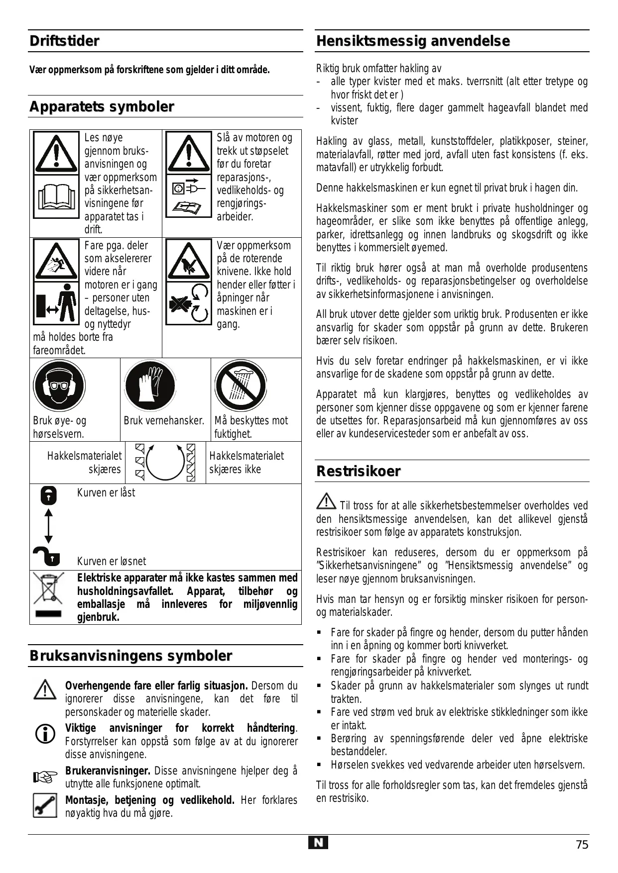 > Bryteren som er utstyrt med motorens sikkerhetsbryter, slès automatisk av nèr apparatet overbelastes: — slà pà hakkelsmaskinen igjen etter ca. fem minutter - les avsnitt "Mulige driftsforstyrrelser”, dersom apparatet ikke kan slàs pà igjen etter denne ventetiden — Skjærevalsen og etterskjæringsplaten er bruksdeler, men har likevel en levetid pà flere är ved normal bruk