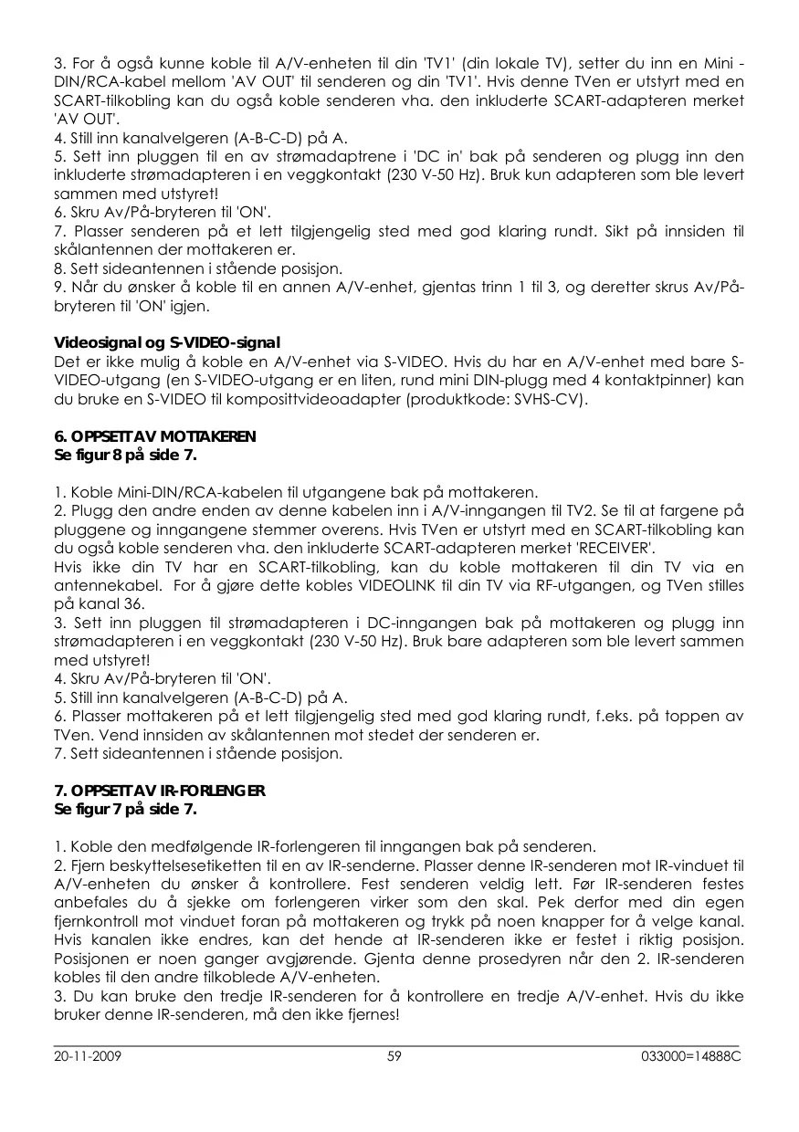 Skru TVen du har koblet mottakeren til, over til TV-kanal 36. Det trådløse VIDEOLINK jobber vanligvis best med de flate antenneflatene på senderen og mottakeren pekende mot hverandre. Noen ganger, uavhengig av avstand, refleksjoner og andre effekter i hjemmet, kan dette pärvirke signaledit sik at justering av enten senders eller mottakers antennne kan være ndvendig for á fá det Beste signaledit. Dersom du fortsett har vanskeligheter, kan du prøve á endre "ABCD" kanalvelgeren og endre kanaler. Men husk at bade senderen og mottakeren ma være innstift på samme kanal. Maksimal avstand mellom sender og mottaker er avhengig av lokale miljøforhold, men i gennomsnitt er avstanden 30 m, gjennom vegger og gulv.