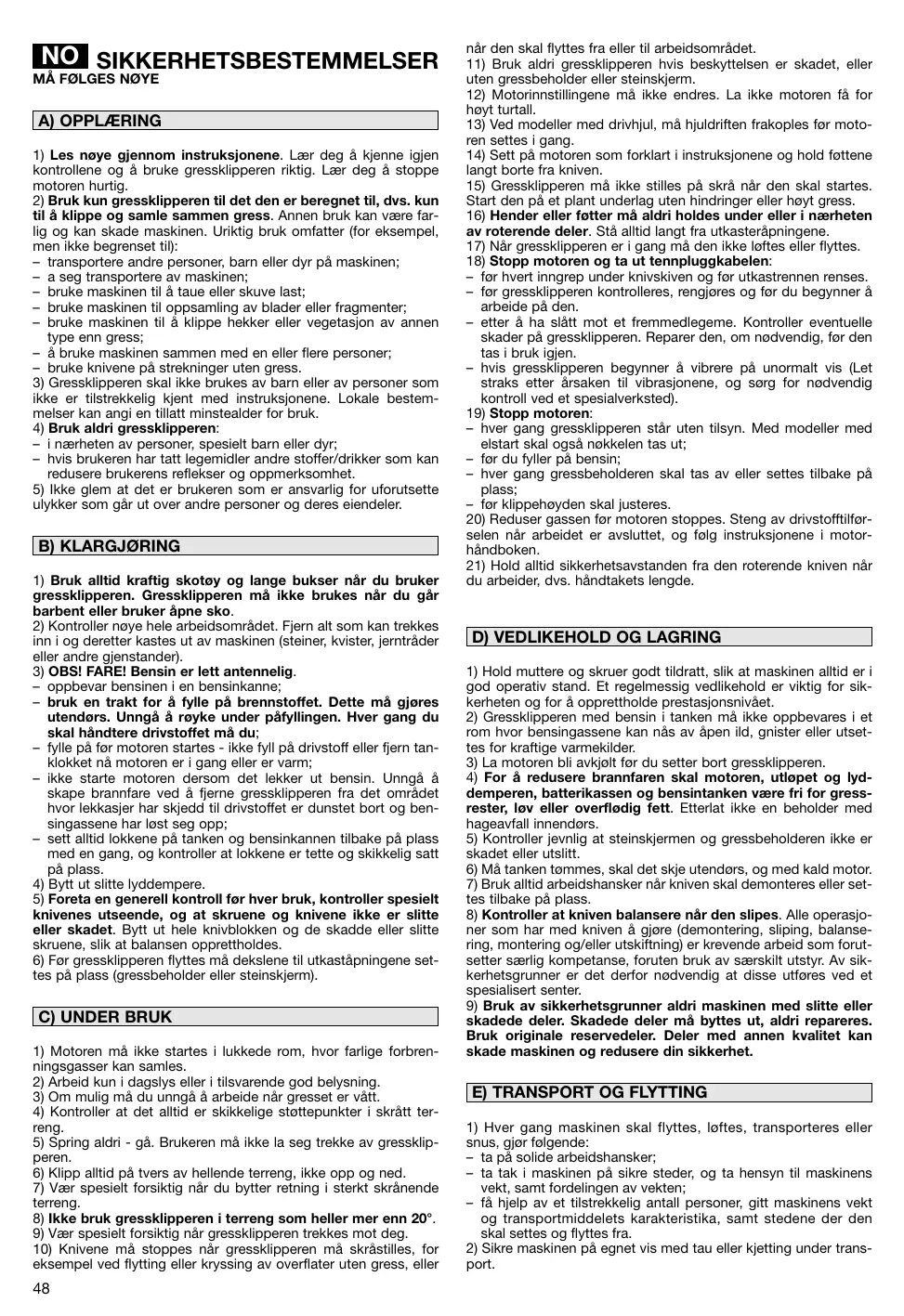 NO SIKKERHETSBESTEMMELSER MÅ FØLGES NØYE A) OPPLÆRING 1) Les nøye gjennom instruksjonene. Lær deg å kjenne igjen kontrollene og å bruke gressklipperen riktig. Lær deg å stoppe motoren hurtig. 2) Bruk kun gressklipperen til det den er beregnet til, dvs. kun til å klippe og samle sammen gress. Annen bruk kan være farlig og kan skade maskinen. Uriktig bruk omfatter (for eksempel, men ikke begrenset til): – transportere andre personer, barn eller dyr på maskinen; – a seg transportere av maskinen; – bruke maskinen til å taue eller skuve last; – bruke maskinen til oppsamling av blader eller fragmenter; – bruke maskinen til å klippe hekker eller vegetasjon av annen type enn gress; – å bruke maskinen sammen med en eller flere personer; – bruke knivene på strekninger uten gress. 3) Gressklipperen skal ikke brukes av barn eller av personer som ikke er tilstrekkelig kjent med instruksjonene. Lokale bestemmelser kan angi en tillatt minstealder for bruk. 4) Bruk aldri gressklipperen: – i nærheten av personer, spesielt barn eller dyr; – hvis brukeren har tatt legemidler andre stoffer/drikker som kan redusere brukerens reflekser og oppmerksomhet. 5) Ikke glem at det er brukeren som er ansvarlig for uforutsette ulykker som går ut over andre personer og deres eiendeler.
