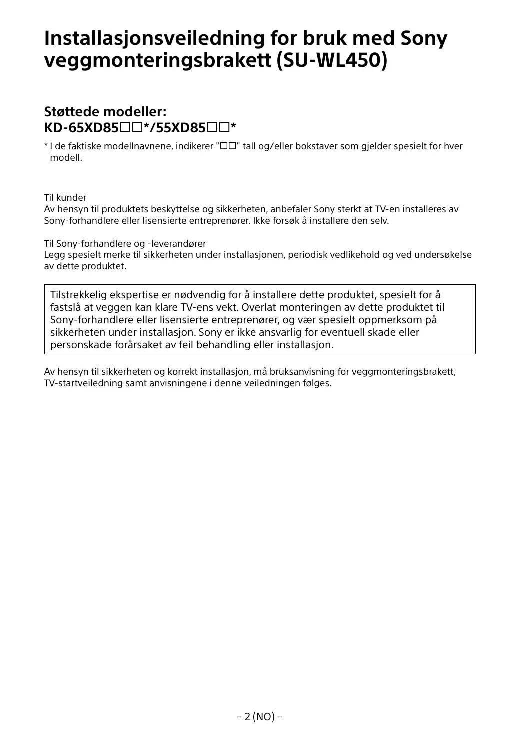 A l’attention des installateurs et revendeurs Sony Soyez particulièrement attentif à la sécurité pendant l’installation, l’entretien périodique et l’examen du produit.
