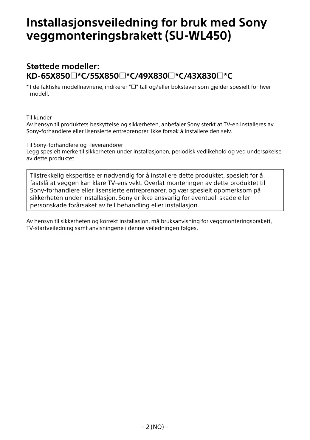 L’installation de ce produit exige un certain savoir-faire. Lisez ce mode d’emploi attentivement afin de procéder à l’installation en toute sécurité. Sony ne saurait être tenue responsable de tout dommage ou de toute blessure découlant d’une mauvaise utilisation ou d’une installation incorrecte. Une fois l’installation terminée, veuillez remettre ce manuel d’installation au client. Ce mode d’emploi indique comment manipuler le produit correctement et contient des précautions essentielles à prendre pour éviter tout accident. Lisez attentivement ce mode d’emploi et veillez à utiliser le produit correctement. Conservez ce mode d’emploi pour toute référence ultérieure. Les produits Sony sont conçus pour vous offrir le maximum de sécurité. Toutefois, si les produits sont utilisés de façon incorrecte, ils peuvent entraîner des blessures graves en provoquant un incendie ou l’électrocution, ou encore la chute de l’appareil hors de son support. Veillez à observer les consignes de sécurité préconisées pour éviter de tels accidents.
