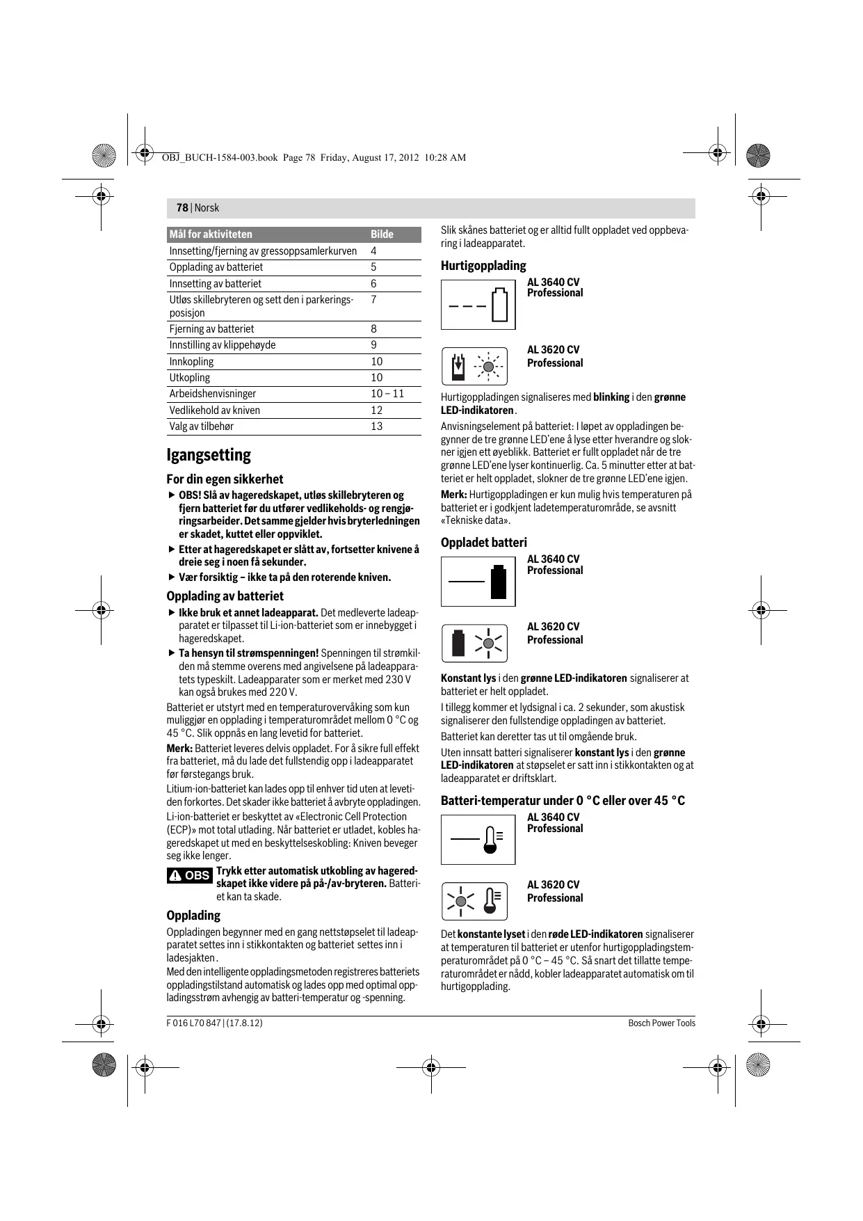 F 016 L70 847 | (17.8.12) OBJ_BUCH-1584-003.book Page 78 Friday, August 17, 2012 10:28 AM 78 | Norsk Mål for aktiviteten Innsetting/fjerning av gressoppsamlerkurven Opplading av batteriet Innsetting av batteriet Utløs skillebryteren og sett den i parkeringsposisjon Fjerning av batteriet Innstilling av klippehøyde Innkopling Utkopling Arbeidshenvisninger Vedlikehold av kniven Valg av tilbehør Bilde