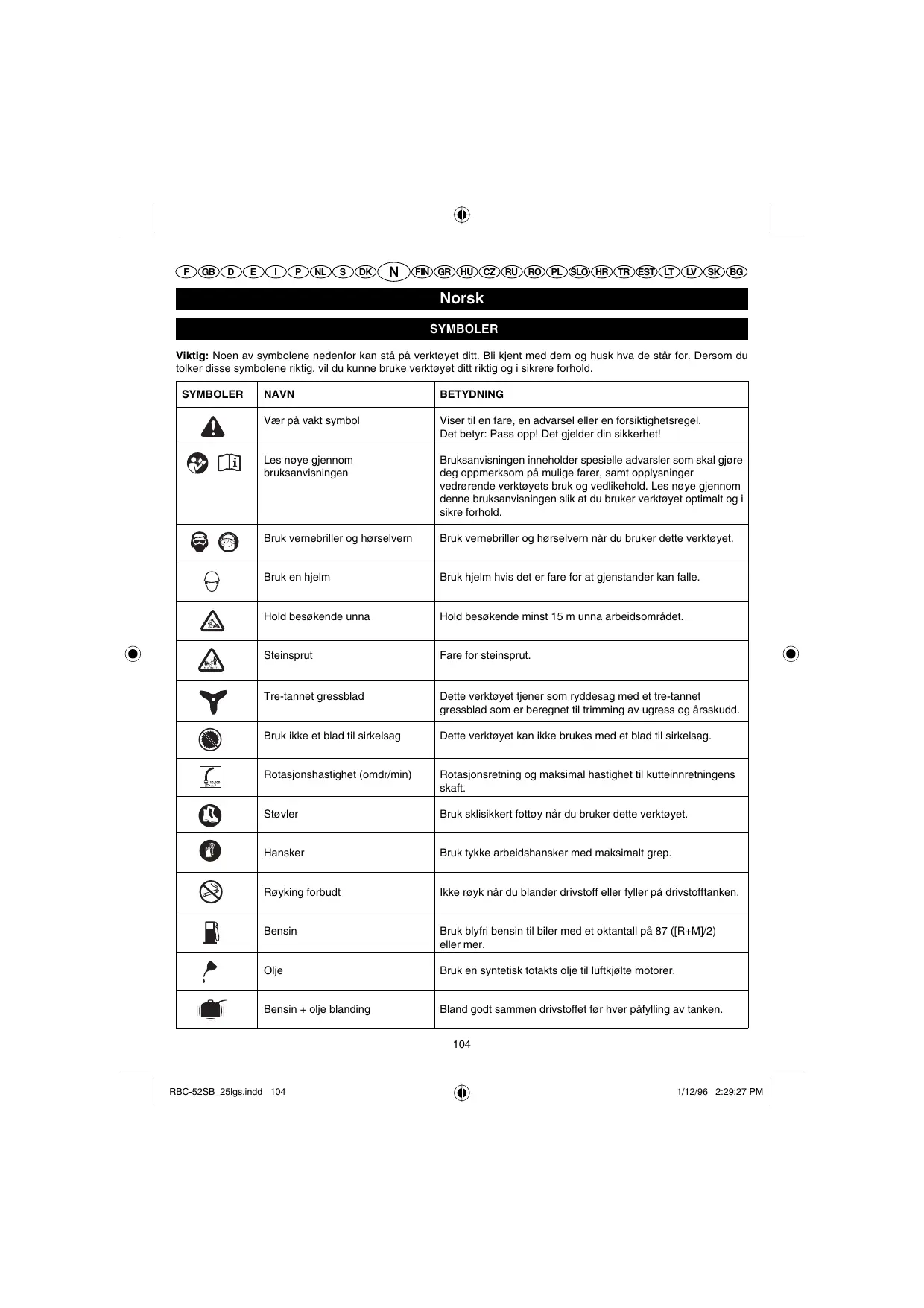 Norsk SYMBOLER Viktig: Noen av symbolene nedenfor kan stå på verktøyet ditt. Bli kjent med dem og husk hva de står for. Dersom du tolker disse symbolene riktig, vil du kunne bruke verktøyet ditt riktig og i sikrere forhold. SYMBOLER NAVN BETYDNING Vær på vakt symbol Viser til en fare, en advarsel eller en forsiktighetsregel. Det betyr: Pass opp! Det gjelder din sikkerhet! Les nøye gjennom bruksanvisningen Bruksanvisningen inneholder spesielle advarsler som skal gjøre deg oppmerksom på mulige farer, samt opplysninger vedrørende verktøyets bruk og vedlikehold. Les nøye gjennom denne bruksanvisningen slik at du bruker verktøyet optimalt og i sikre forhold. Bruk vernebriller og hørselvern Bruk vernebriller og hørselvern når du bruker dette verktøyet. Bruk en hjelm Bruk hjelm hvis det er fare for at gjenstander kan falle. Hold besøkende unna Hold besøkende minst 15 m unna arbeidsområdet. Steinsprut Fare for steinsprut. Tre-tannet gressblad Dette verktøyet tjener som ryddesag med et tre-tannet gressblad som er beregnet til trimming av ugress og årsskudd. Bruk ikke et blad til sirkelsag Dette verktøyet kan ikke brukes med et blad til sirkelsag. Rotasjonshastighet (omdr/min) Rotasjonsretning og maksimal hastighet til kutteinnretningens skaft. Støvler Bruk sklisikkert fottøy når du bruker dette verktøyet. Hansker Bruk tykke arbeidshansker med maksimalt grep. Røyking forbudt Ikke røyk når du blander drivstoff eller fyller på drivstofftanken. Bensin Bruk blyfri bensin til biler med et oktantall på 87 ([R+M]/2) eller mer. Olje Bruk en syntetisk totakts olje til luftkjølte motorer. Bensin + olje blanding Bland godt sammen drivstoffet før hver påfylling av tanken.