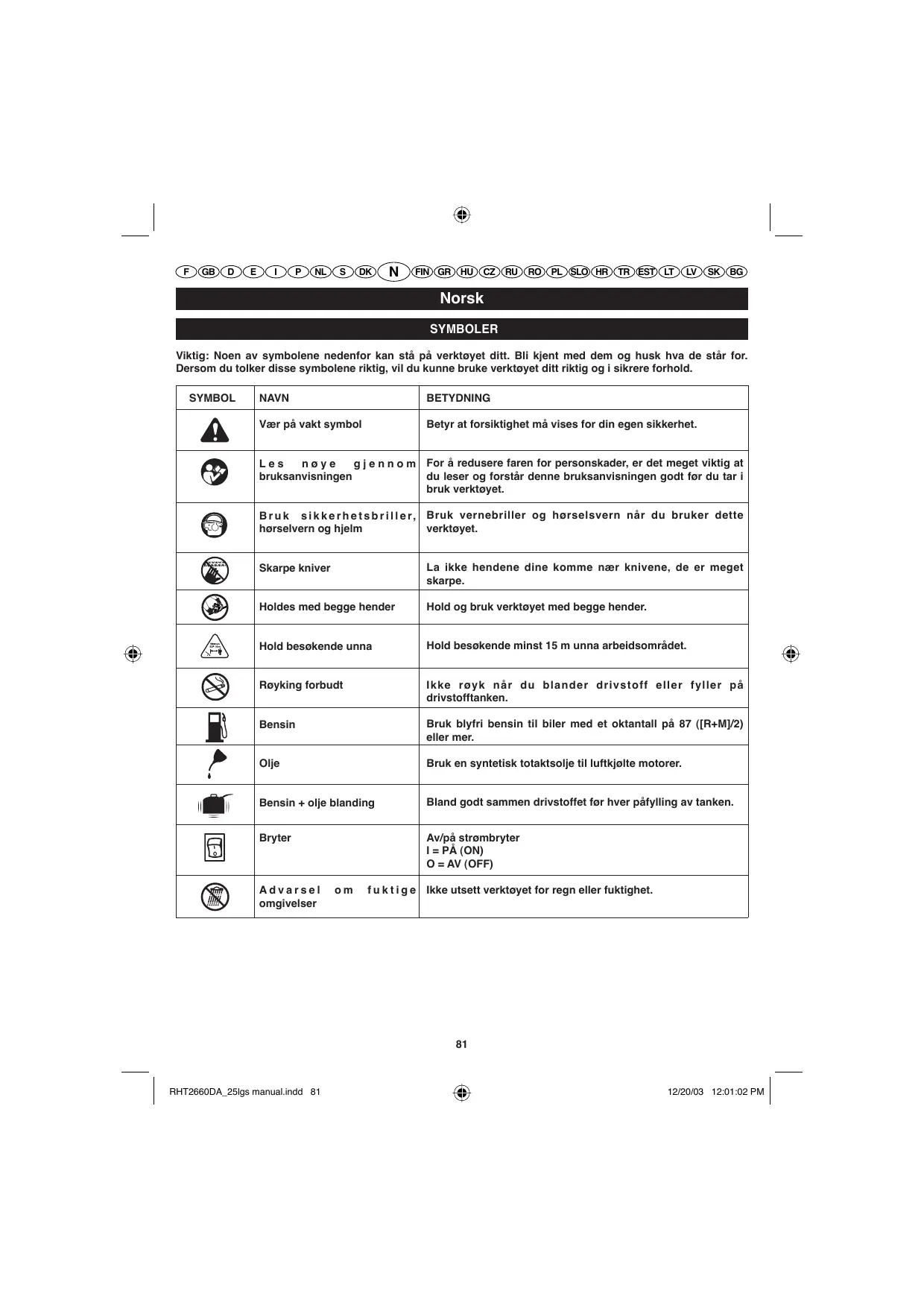 12/20/03 12:01:02 PM F GB D E I P NL S DK N FIN GR HU CZ RU RO PL SLO HR TR EST LT LV SK BG Norsk SYMBOLER Symbolene nedenfor, og navnene som følger med, gjør det mulig å forklare de forskjellige farenivåene som er tilknyttet bruken av verktøyet.