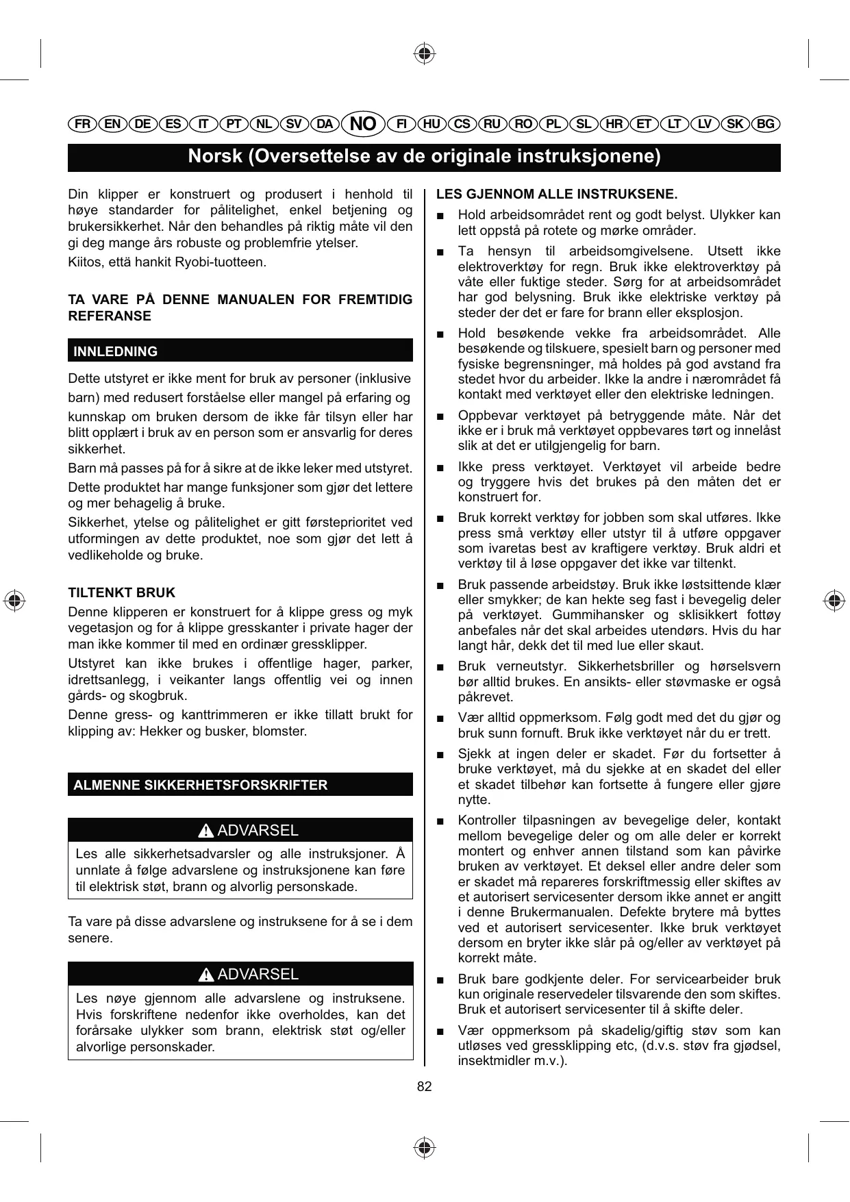 Norsk (Oversettelse av de originale instruksjonene) Din klipper er konstruert og produsert i henhold til høye standarder for pålitelighet, enkel betjening og brukersikkerhet. Når den behandles på riktig måte vil den gi deg mange års robuste og problemfrie ytelser. Kiitos, että hankit Ryobi-tuotteen. LES GJENNOM ALLE INSTRUKSENE.