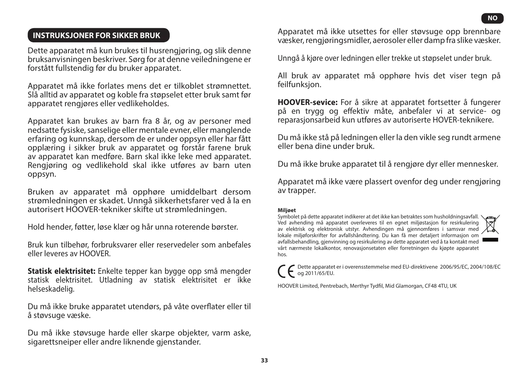 Service HOOVER: Pour assurer l’utilisation sûre et efficace de cet appareil, nous recommandons de n’en confier l’entretien ou les réparations qu’à un réparateur HOOVER agréé.
