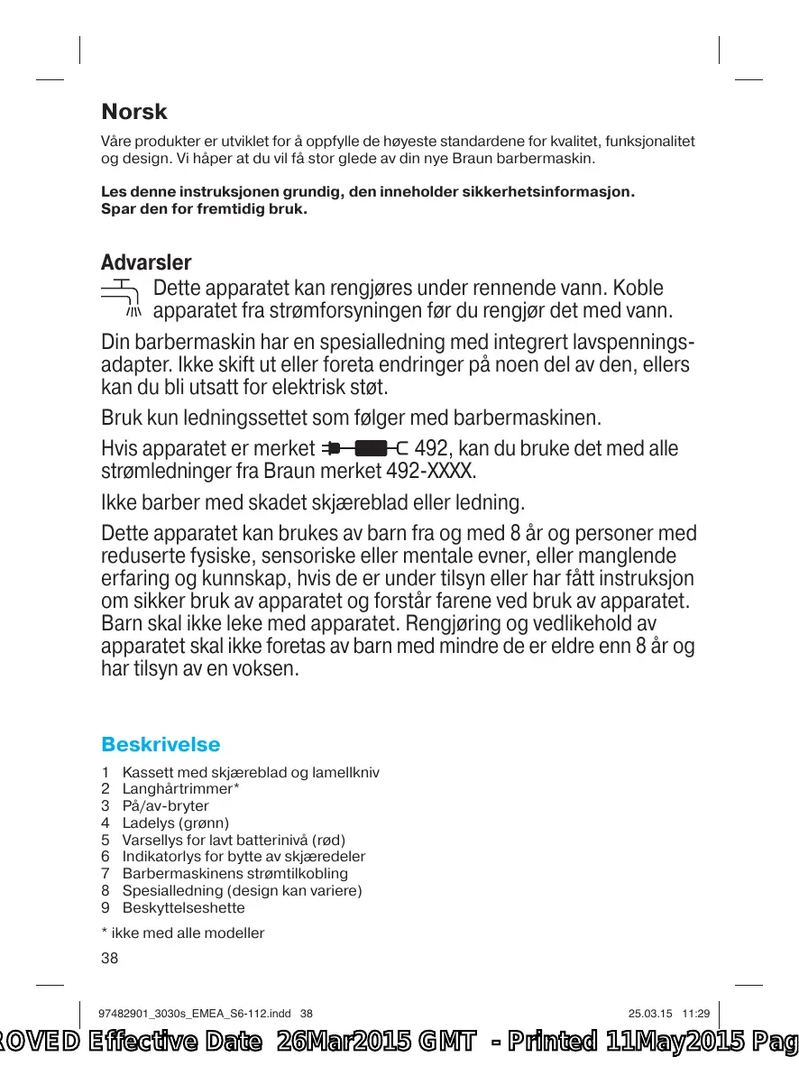 492, puede utilizarlo con cualquier cable de alimentación de Braun con código tipo 492-XXXX. No se afeite si tiene una lámina o el cable de alimentación dañados. Este aparato puede ser utilizado por niños a partir de los 8 años y personas con capacidades físicas, sensoriales o mentales reducidas o con falta de experiencia y conocimiento, si lo hacen bajo supervisión o si se les ha dado instrucciones adecuadas para el uso seguro del aparato y entienden los riesgos que implica. Los niños no deben jugar con el aparato. Los niños deben ser mayores de 8 años para realizar la limpieza y el mantenimiento del aparato, y siempre bajo supervisión. Descripción Luz roja indicadora de carga baja Indicador de recambio de piezas Enchufe de la afeitadora Cable especial (el diseño puede variar) Protector del cabezal