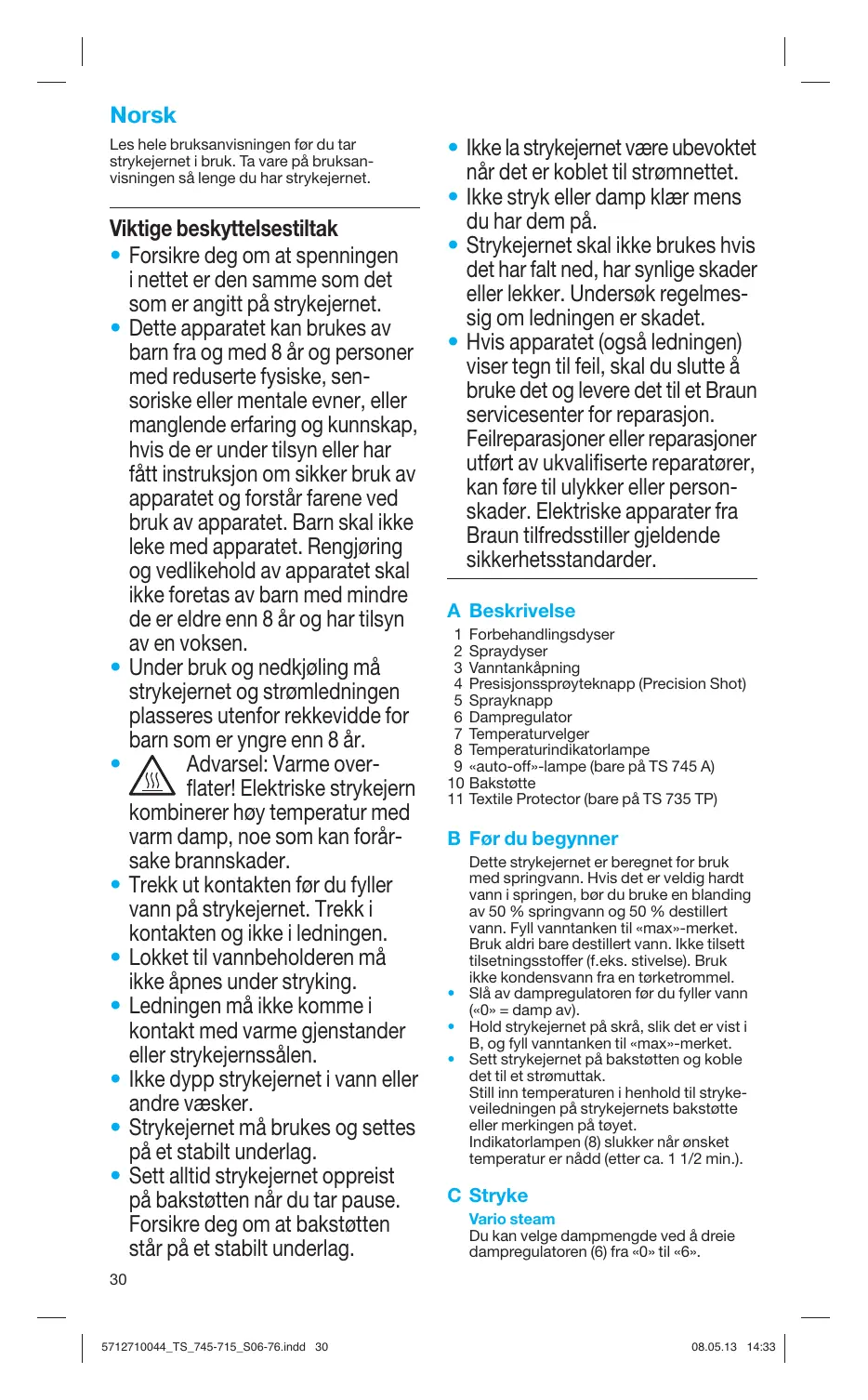 - Under bruk og nedkjøling må strykejernet og strømledningen plasseres utenfor rekkevidde for barn som er yngre enn 8 år. Advarsel: Varme overflater! Elektriske strykejern kombinerer høy temperatur med varm damp, noe som kan forårsake brannskader.