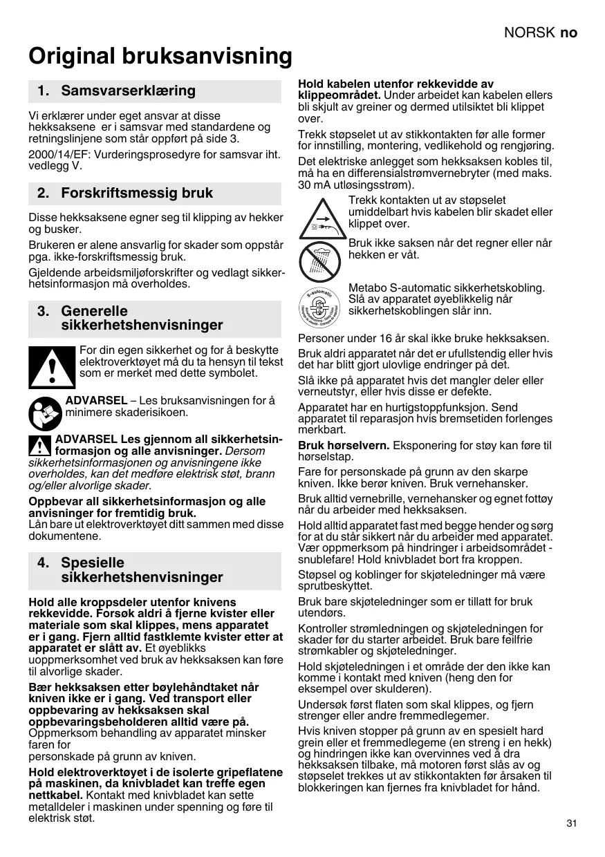 Hvis kniven stopper på grunn av en spesielt hard grein eller et fremmedlegeme (en streng i en hekk) og hindringen ikke kon overvinnes ved à dra hekksaksen tilbake, má motoren Först slås av og stopselet trekkes ut av stikkontakten forårsaken til blokkeringen kan fjernes fra knivbladet for hand.