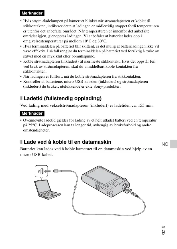 - Ovennevnte ladetid gjelder for lading av et helt utladet batteri ved en temperatur på 25°C. Ladeprosessen kan ta lenger tid, avhengig av bruksforhold og andre omstendigheter. x Lade ved å koble til en datamaskin
