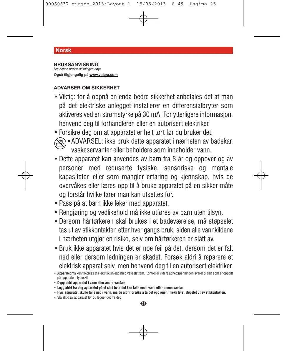 • Veillez à ne jamais obstruer les entrée et sortie d’air de l’appareil. • Laissez toujours l’appareil refroidir avant de le ranger, et, n’entourez pas le cordon électrique autour de l’appareil lors du stockage. • (Seulement Type 560.., 580.., 581.., 583.., 584..) Ce sèche-cheveux est destiné à un usage professionnel. Réglé sur une température maximale, l’appareil libère de l’air très chaud. En cas d’usage domestique, sélectionner une température plus basse et ne pas insister trop longtemps sur une même partie de la chevelure afin d’éviter d'abîmer les cheveux ou des lésions cutanées. Important Ce sèche-cheveux est conforme aux normes de sécurité relatives aux appareils électriques. Cet appareil est muni d’un thermostat de sécurité. En cas de surchauffe, il s’arrête automatiquement. Après un court délai, il se remet en marche. Cependant, avant toute nouvelle utilisation, vérifiez que les grilles d’entrée et de sortie d’air de l’appareil sont parfaitement propres. Cet appareil est conforme aux directives européennes 2004/108/CE, 2009/125/CE, 2006/95/CE et au règlement (CE)N. 1275/2008.